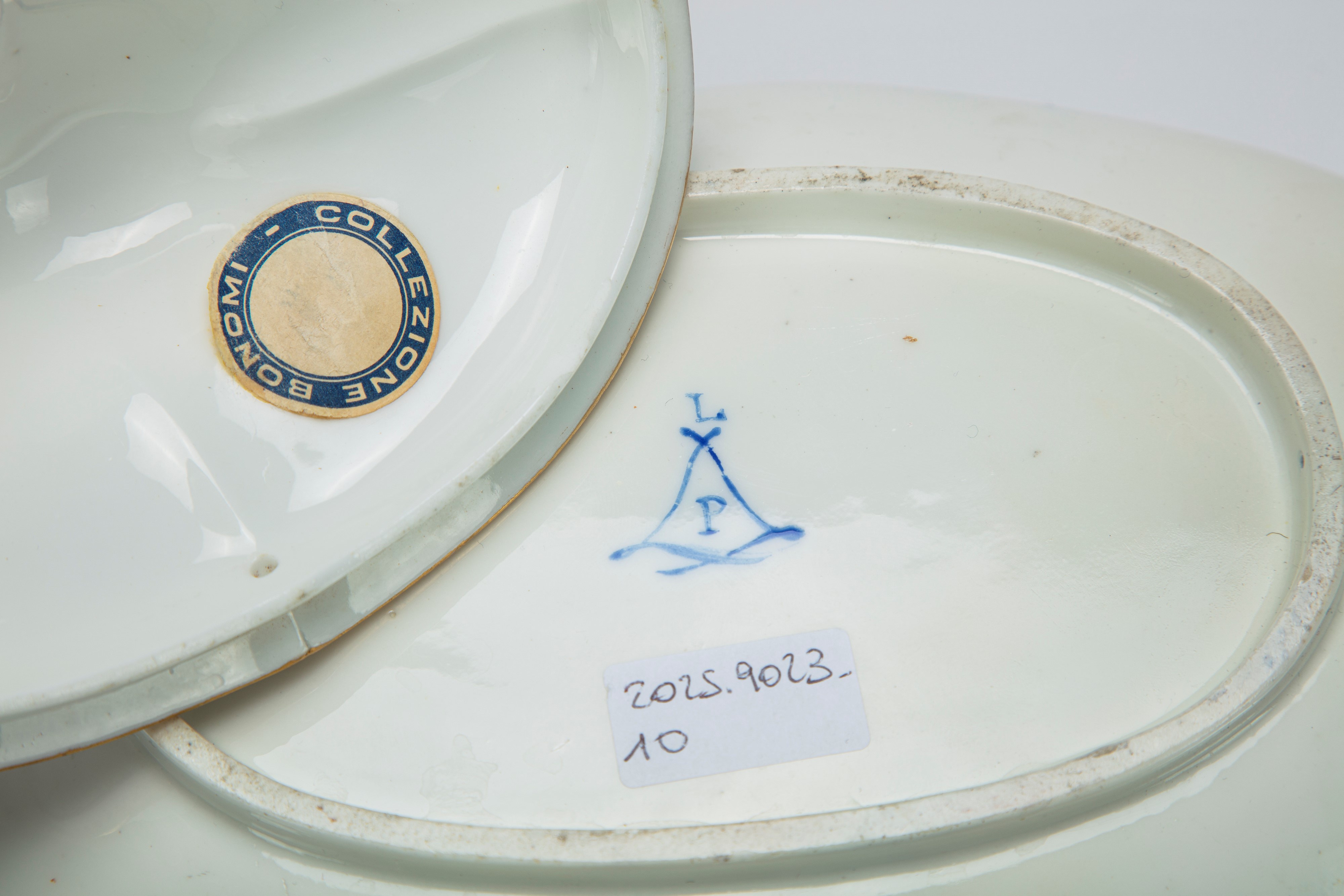 Di forma lobata, con piatto a corpo in porcellana decorata in policromia a mazzetti di fiori sparsi con profili in blu e oro.