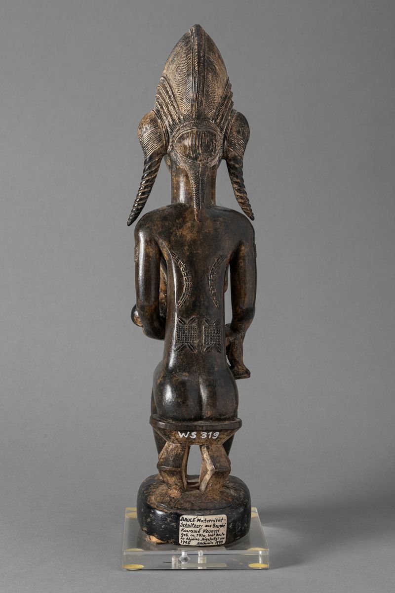 Secondo la ricercatrice americana Susan Vogel (**) che ha documentato il mondo dell’arte Baulé, questa scultura rappresenta il ritratto di una giovane donna che presenta alla comunità il suo bambino appena nato.È stata conservata per lungo tempo dalla sua proprietaria che l’ha trattata con grande cura, strofinandola con unguenti e panni delicati, come si può notare nelle zone del legno che risultano più levigate per i continui sfregamenti.La donna è seduta su un seggiolino riservato ai personaggi importanti della comunità.Sul viso e sul corpo mostra i segni di preziosi tatuaggi che evidenziano il suo elevato rango sociale. Potrebbe rappresentare la moglie di un sovrano o di un capo villaggio.Il viso è scolpito in un atteggiamento di serenità ma anche di grande attenzione per il piccolo che tiene nelle mani mentre lo allatta. Forse rappresenta il suo primogenito. La sua pettinatura, molto elaborata, è quella riservata alle donne di rango elevato, così come i tatuaggi presenti su tutto il corpo.Oltre alle trecce laterali, che scendono arrotolate sulle spalle, è una composizione di ciocche incise con tratti sottili che, dalla sommità della nuca, scendono a gradini fino a coprire le orecchie. A differenza di altre sculture Baulé, che di norma risultano simmetriche, qui la composizione è molto complessa, sia per la posizione della donna seduta, che per la presenza del bambino. È noto che le rappresentazioni di madri con bambini sono rare nell’arte Baulé. La difficoltà dell’esecuzione, con l’alternarsi di volumi pieni e vuoti, resi con grande equilibrio formale, l’eleganza dei particolari ma, soprattutto, il fine lavoro d’intaglio con cui è realizzata la pettinatura, sono dettagli che testimoniano l’opera di un grande maestro dell’arte Baulé.