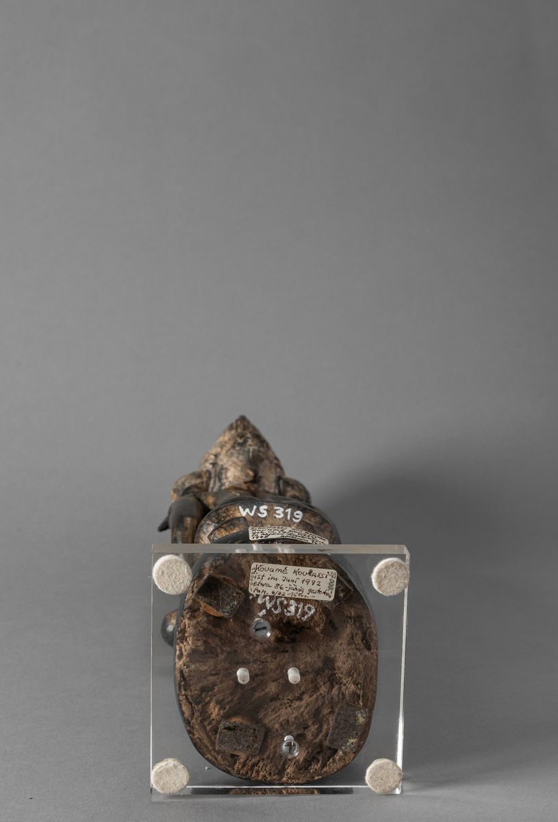 Sul retro della scultura un’etichetta segnala che l’opera è stata realizzata dallo scultore Kouassi Kouame intorno al 1945 (*);