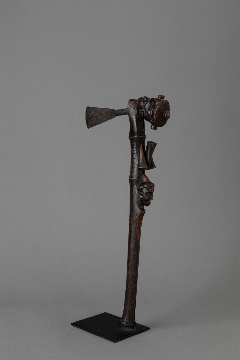 Lama in ferro forgiato ricoperta con patina d’epoca. Impugnatura in legno abbellita con la testa di due personaggi, uno maschile scolpito nella parte superiore, l’altro femminile scolpito in rilievo a metà dell’asta. Bullette di ferro e ottone rendono l’ascia più preziosa. Bella patina d’uso.Oggetto di prestigio