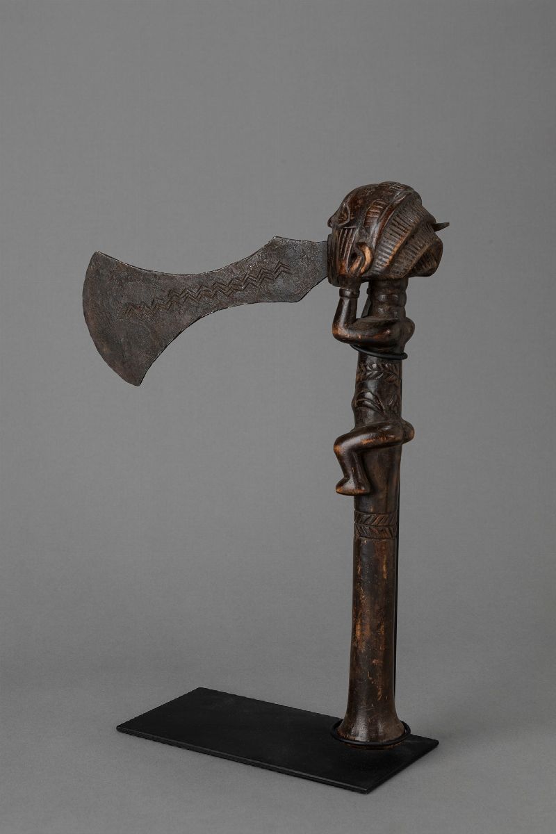 La tradizione delle asce da parata dei Luba, Hemba, Songye, gruppi che abitano le regioni meridionali del Congo, prevede un’impugnatura corta, scolpita all’apice con una testa di figura umana, ma anche con un personaggio intero, come in questo caso.La lama, in genere abbastanza lunga, esce verticalmente dalla bocca del personaggio. Considerate simboli reali, erano utilizzate in occasione delle danze della setta religiosa Mbudye.Le figure scolpite in miniatura sull’impugnatura riproducono le caratteristiche della statuaria del gruppo Luba Shankadi nelle quali le figure femminili riprendono la famosa pettinatura delle ciocche a cascata.