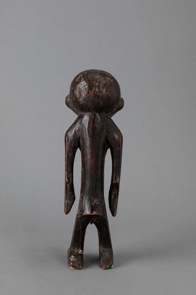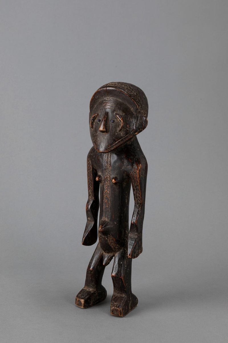 Scultura dal forte impianto astratto dove la testa a prisma triangolare è sostenuta da un corpo cilindrico rappresentato in tutti i suoi elementi anatomici. Le braccia staccate dal corpo sono molto allungate, al contrario delle gambe che risultano più corte. Gli occhi sono piccole perline di vetro. Tutta la figura è stata decorata con una serie di tatuaggi a zigzag. La forma del viso triangolare, segnato da incisioni a linee parallele sulla fronte e sulle guance, è una caratteristica comune alle sculture di questo gruppo. Le statue erano collocate in una specie di abitacolo all’ingresso dei villaggi. Rappresentavano lo spirito Ngbirondo che, secondo le credenze indigene, avevano lo scopo di proteggere i villaggi. Erano anche utilizzate dal deviner nelle pratiche di chiaroveggenza.