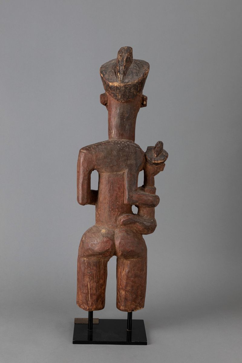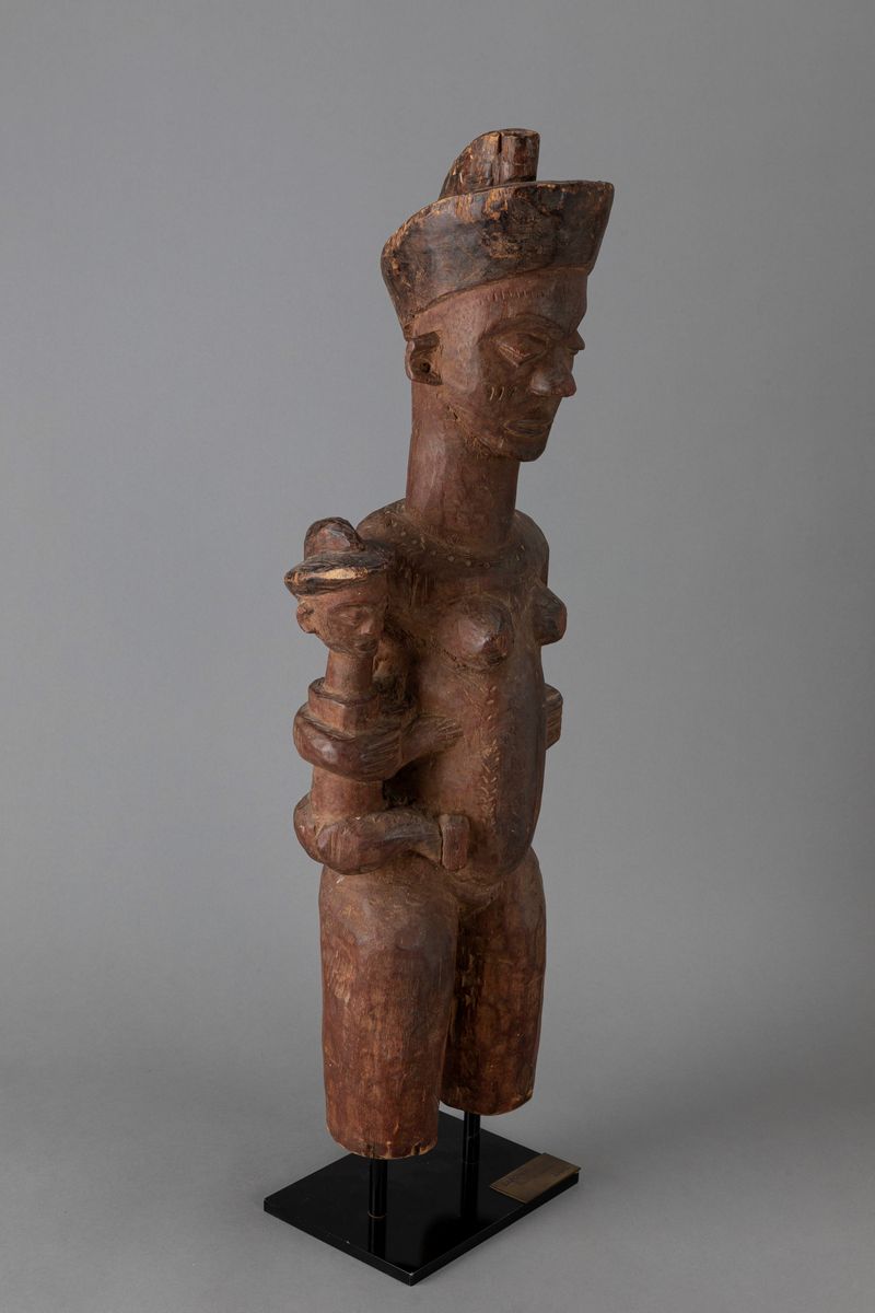 I Pende dell’est o Pende Kasai, come spesso viene citato questo gruppo, vivono in una vasta area meridionale della Repubblica Democratica del Congo ai confini con l’Angola. Questa figura di madre che regge il piccolo sostenendolo con il braccio destro è una rappresentazione insolita nella scultura Pende. In particolare, la madre col bambino è estremamente rara nella tradizione culturale di questo gruppo che si è espresso soprattutto nelle più diffuse maschere Mbuya indossate durante le cerimonie della circoncisione dei giovani.Le sculture femminili con il bambino in braccio erano collocate sul tetto delle capanne dei capi villaggio per adornare la casa. Avevano la funzione di raffigurare la loro moglie preferita.Queste opere, le cui dimensioni si aggirano sul metro d’altezza, erano scolpite solo nei ¾ superiori ed in basso terminavano con una grossa base rettangolare che serviva da sostegno.Questo esemplare è stato scolpito senza la base d’appoggio e, con ogni probabilità, era custodito gelosamente nella residenza del capo villaggio assieme agli altri oggetti rituali.Sia la madre che il bambino indossano un copricapo che caratterizza queste opere.Le palpebre a punta verso il basso ed il naso è all’insù sono dettagli che si trovano nelle loro maschere di danza.I tatuaggi verticali sul viso della donna sono molto diffusi anche nelle maschere Suku e Bambala, due gruppi che vivono nei territori limitrofi.