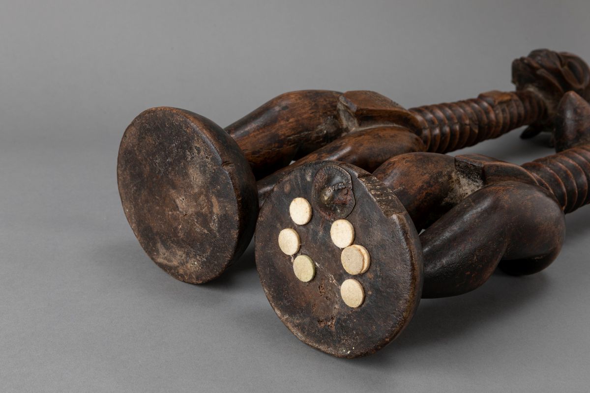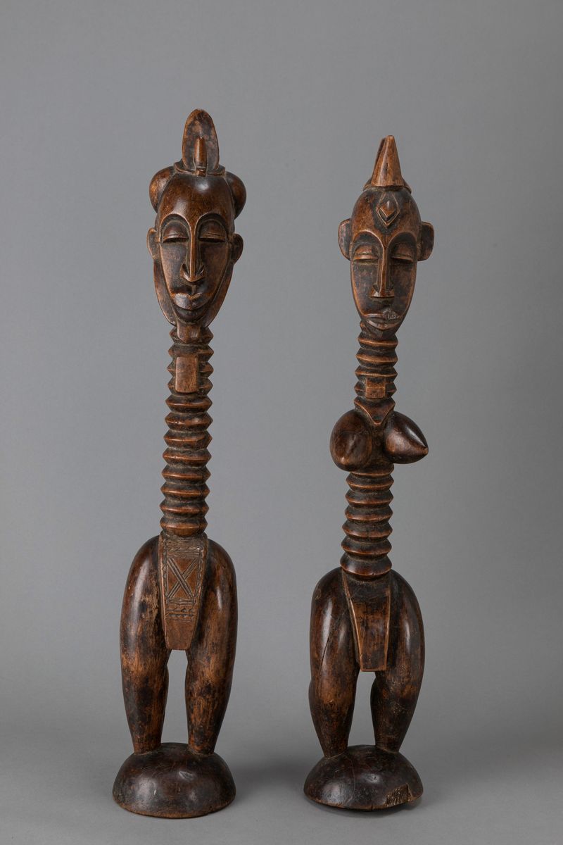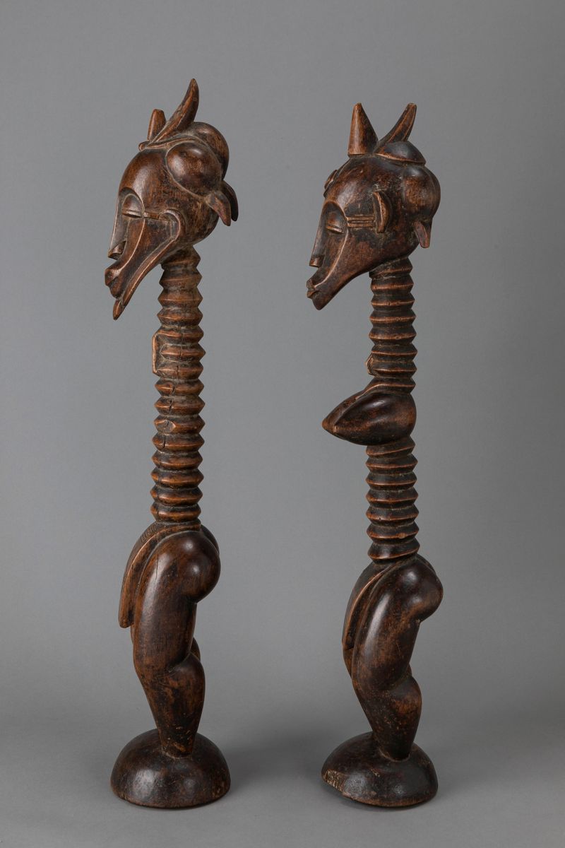 Secondo un’antica tradizione Senufo questi due personaggi rappresentano l’immagine di spiriti protettori della foresta. Il corpo, senza i piedi, è sostenuto da una base emisferica. Sono opere rare e lo stile ricorda la famosa coppia della collezione di Samuel Dubiner. È probabile che questa coppia di sculture fosse stata conservata all’interno di un santuario, tenuta coperta con un panno protettivo.Il legno è stato accuratamente levigato con foglie abrasive allo scopo di rendere lisce le superfici sulle quali sono tuttora presenti residui di polvere chiara. Sotto la base dell’esemplare femminile è inchiodato un dischetto di rame lavorato.Alcune immagini di riferimento sono scolpite sulla cima dei caschi di danza utilizzati dagli adepti della società “Lo”, una setta che regolava la vita sociale e religiosa dell’intero popolo Senufo. I caschi di danza, che uscivano assieme alla famose sculture chiamate Deble, venivano indossati in occasione dei funerali di importanti personaggi della comunità. La rarità di questi caschi è suggerita non solo dai pochi esemplari conosciuti, ma anche dal loro uso, infatti, uscivano solo in occasione del “grande funerale” al quale partecipava tutta la comunità che commemorava gli antenati morti negli ultimi 4 o 5 anni. Le figure denotano un forte astrattismo e solo il volto mostra una certa somiglianza con la tradizione delle opere Senufo. La struttura del corpo, con il collo a spirale e l’assenza di braccia, è assai rara nella statuaria Senufo. Questo stile è presente in alcuni caschi di danza Déguélé che provengono anch’essi dalla regione di Korhogo. La loro realizzazione sarebbe l’opera del sottogruppo Kiembarache operava nella collettività dei Fodombélé. La pettinatura a cresta di gallo suggerisce il richiamo “all’uccello sacro delle anime".
