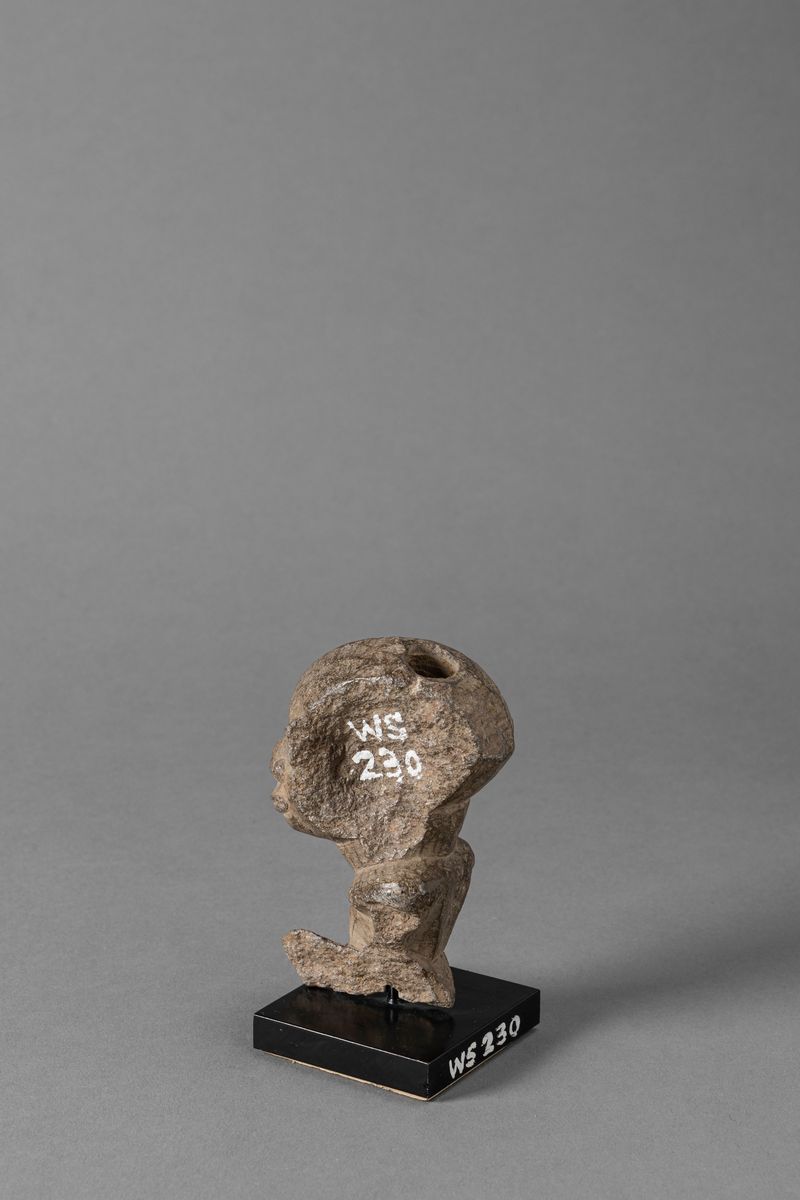 Frammento del corpo di un personaggio maschile Nomoli. La parte sinistra è assente.La testa è scolpita nel modo classico dei capi Sapi. Forma globulare con grandi occhi a bulbo, palpebre sporgenti ad arco, naso adunco con narici dilatate, bocca chiusa a labbra sporgenti, grandi orecchie stilizzate, foro al centro dl cranio.