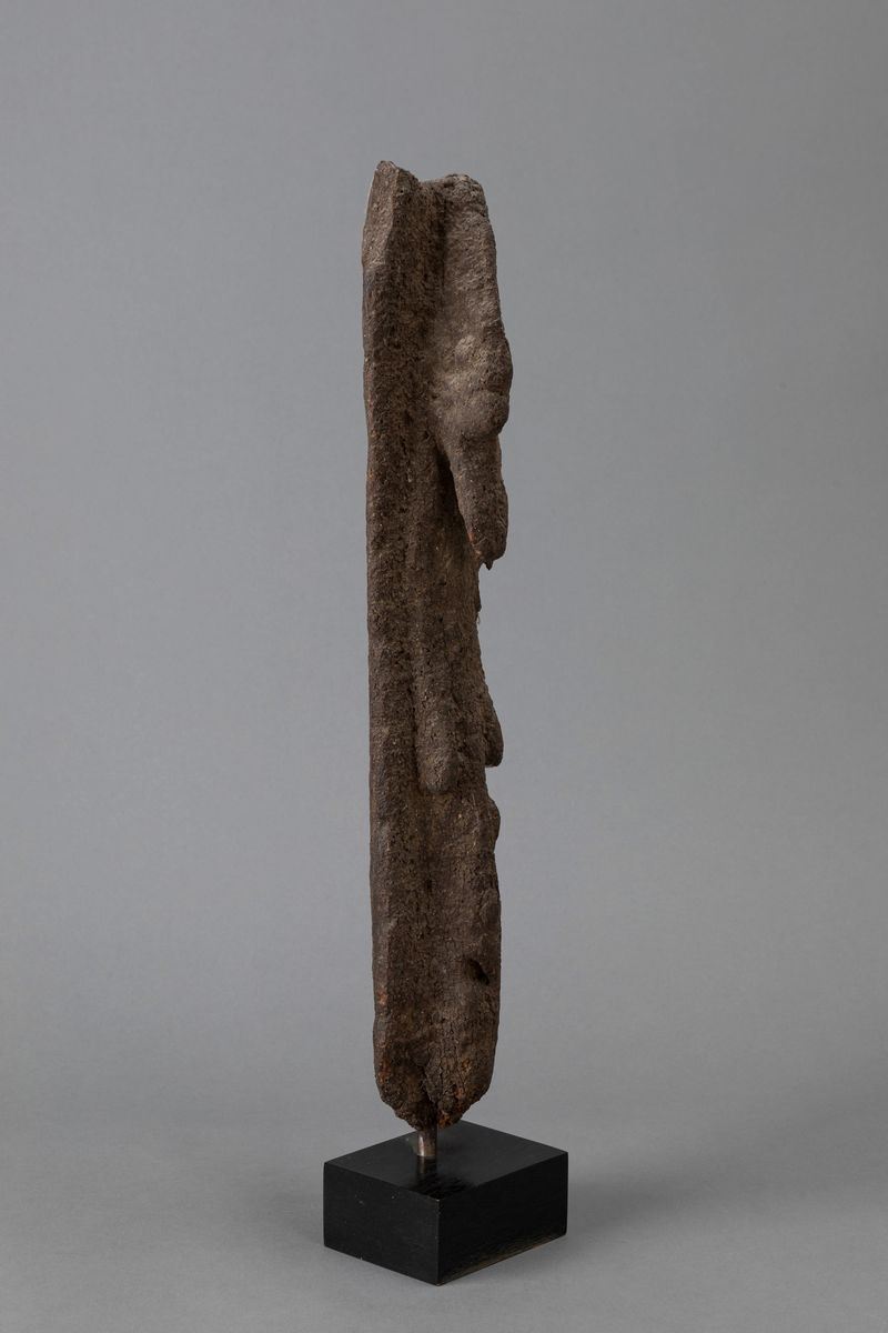 La scultura rappresenta un Nommo, una figura ancestrale che emerge in rilievo da una tavoletta: sembra che dal legno esca l’immagine sfocata di un corpo umano. Le braccia alzate verso l’alto, ora quasi scomparse, riprendono un gesto di richiamo rivolto alle divinità. Il volto primordiale, lascia intravedere occhi, bocca ed una barba appuntita. I lunghi seni sono la testimonianza di un essere soprannaturale che detiene entrambi i sessi, un modello ripreso poi nella tradizione Dogon: un popolo che l’antropologo francese Marcel Griaule, con le sue ricerche nel Mali, ha fatto conoscere al mondo.