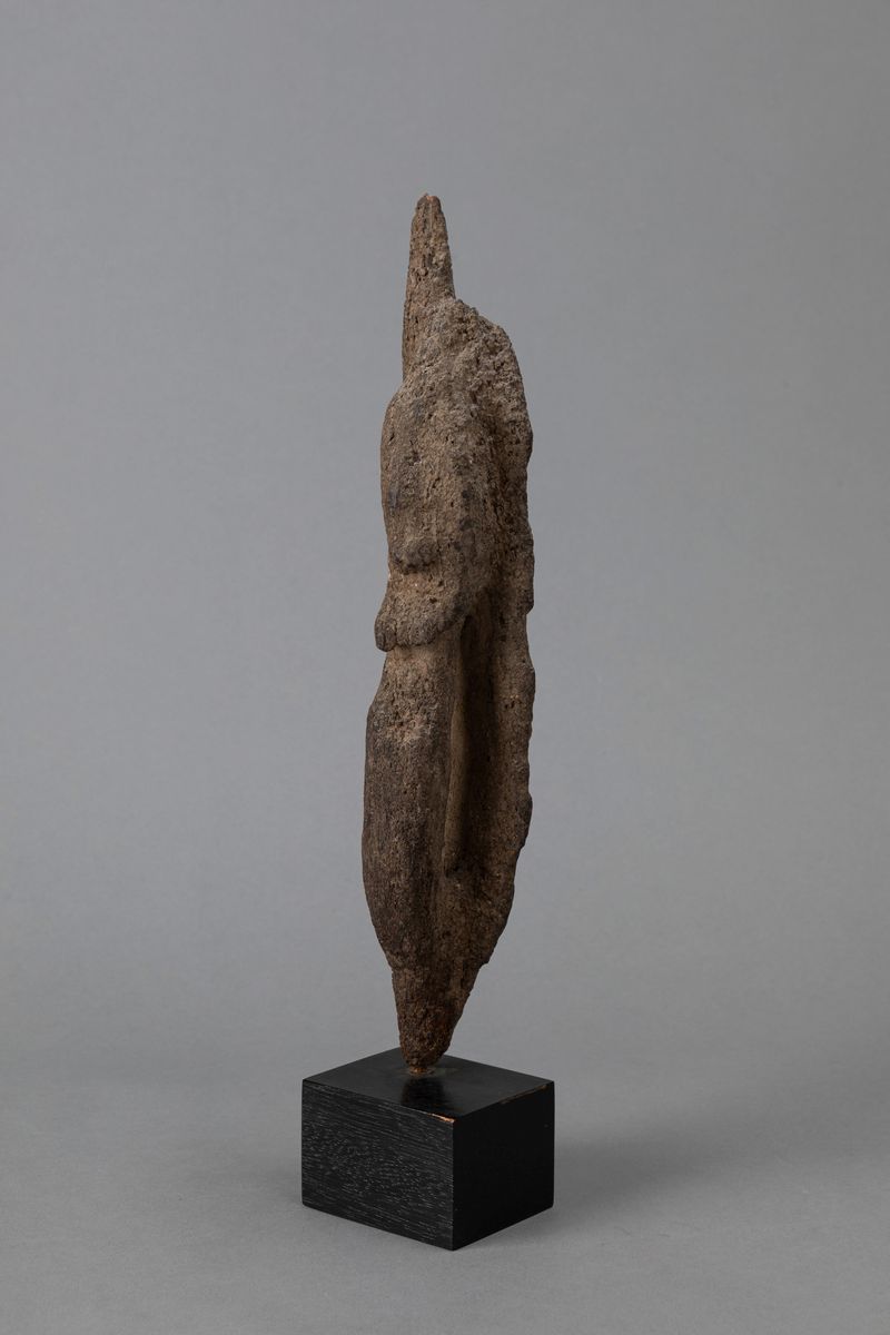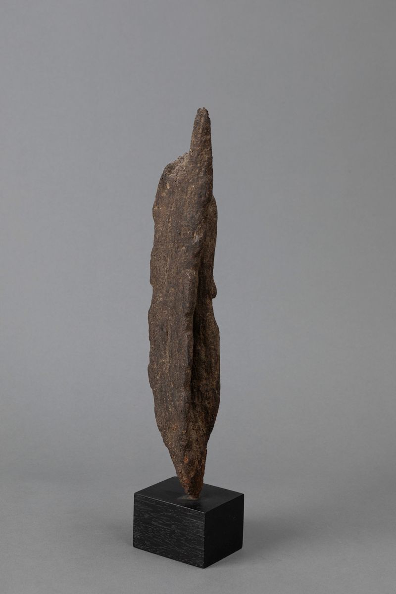 Legno duro ricoperto con un impasto di sostanze sacrificali che conferiscono alla scultura un colore grigiastro.
