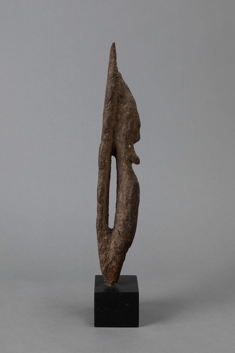 La scultura rappresenta una figura ancestrale che emerge in rilievo da una tavola dorsale che in origine proseguiva sopra la testa.La figura umana ha il corpo che, nella sua parte centrale, si stacca ad arco e si richiude a punta verso il basso. È un dettaglio raro che si riscontra in altre opere Tellem. Sembra che dalla materia del legno esca l’immagine sfocata di un corpo umano costituito solo dalla testa