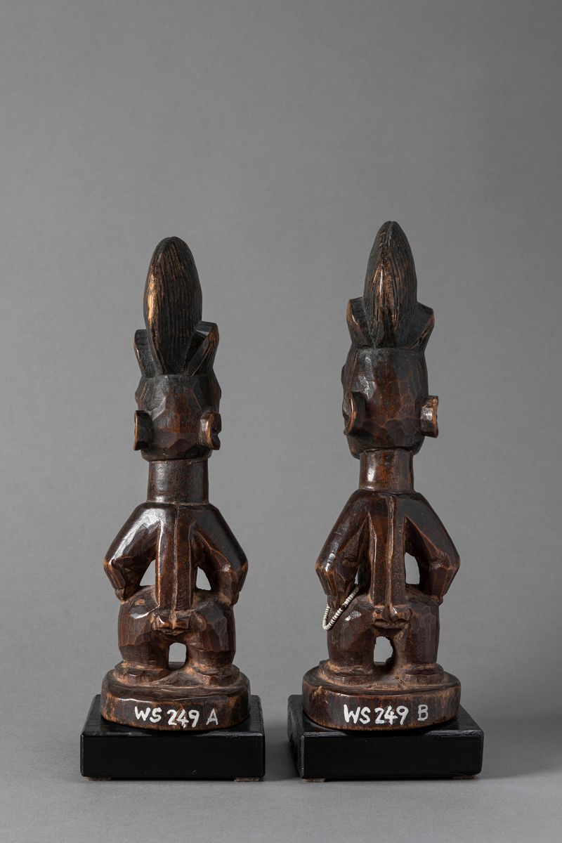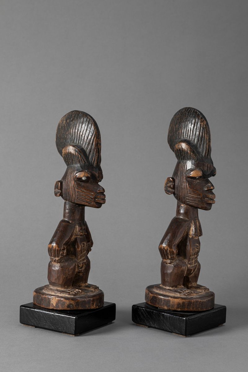 Due esemplari scolpiti secondo gli stilemi che, per una lunga tradizione, si sono diffusi nella Nigeria meridionale e nella Repubblica del Benin. È un tipo di arte che risulta riconoscibile e che si è tramandata nel tempo sotto la spinta creativa dei tanti scultori che lavoravano nelle ateliers anche molto lontane una dall’altra. Queste piccole sculture, di sesso maschile o femminile, rappresentano dei gemelli. La nascita di due o più gemelli è considerata presso le popolazioni nigeriane un evento importante e dopo tale occasione, dai fortunati genitori, viene chiesto allo scultore del villaggio di preparare gli Ibeji, la coppia di statuine con lo stesso sesso dei gemelli nati.Esse formeranno con i proprietari uno stretto legame spirituale. Le sculture così scolpite saranno custodite e trattate con massima cura per tutta la vita. Nel caso di decesso di uno dei gemelli, il dualismo con l’altro continuerà attraverso la statuina che diventerà così l’incarnazione dello spirito del gemello defunto. Solo dopo la morte di entrambi i gemelli le statuine perderanno il loro significato e valore sacro e, pertanto, potranno essere cedute.