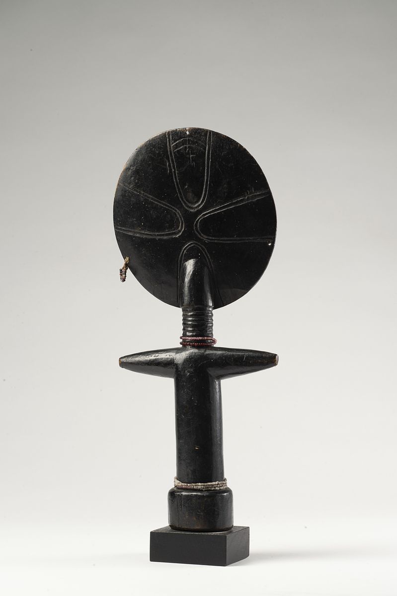 Forma classica a tronchetto sostenuto da una base cilindrica. Perline di vetro come orecchini e collane intorno al corpo.