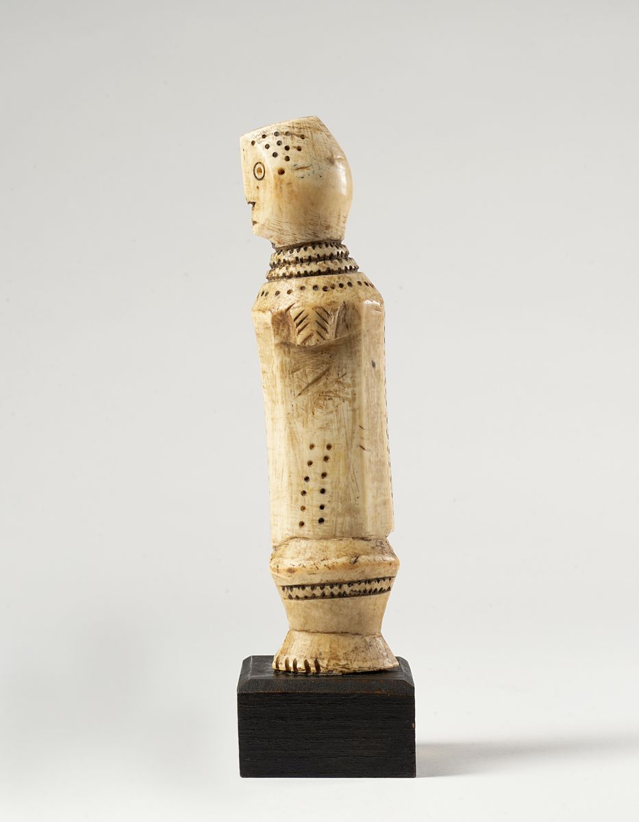 Esemplare scolpito in avorio che corrisponde ad uno stile arcaico della tradizione Lega.La statuina si presenta frontalmente con il volto che assume la forma a losanga. La bocca socchiusa e gli occhi a dischi concentrici donano al viso un’espressione di stupore. Le braccia sono appena accennate e le corte gambe sorreggono il corpo cilindrico. La scultura è impreziosita con una serie di motivi a zigzag e da una complessa decorazione a piccoli cerchi. Una tipica lavorazione degli avori Lega.