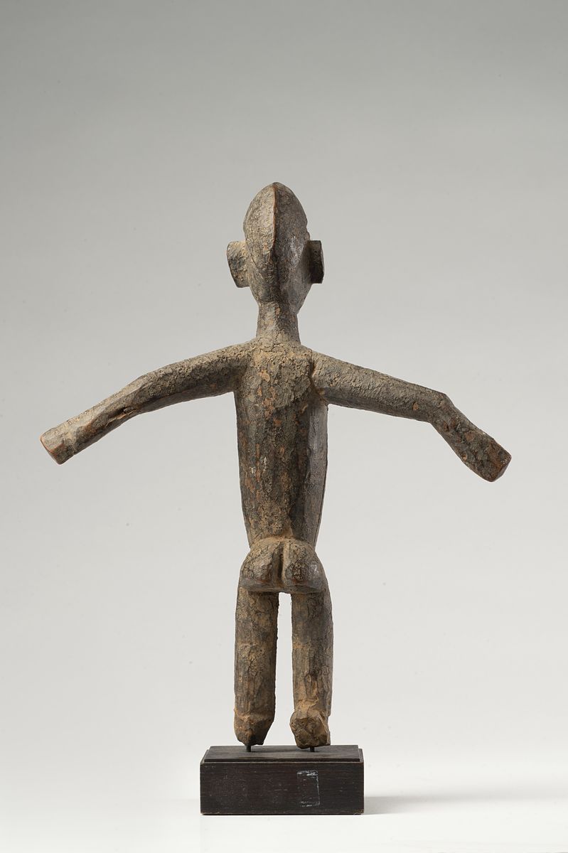 Il corpo, in posizione frontale, è ripreso con braccia aperte: un atteggiamento insolito difficile da eseguire. Tutta la superficie del legno è ricoperta con una densa patina crostosa di colore scuro, una caratteristica dei pezzi più antichi. I piedi sono consumati per il lungo contatto con il terreno umido del santuario familiare sotterraneo dove erano custodite le sculture sacre.