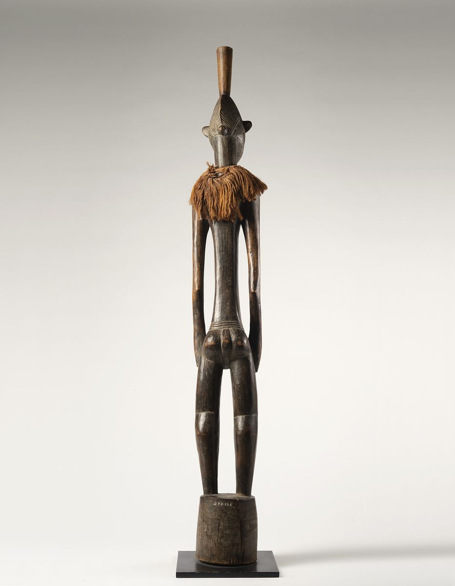 Scultura maschile scolpita secondo i criteri stilistici diffusi tra gli scultori Senufo della regione di Sikasso. Sulla testa è presente il “Calao”, l’uccello emblematico dei Senufo, il volto è segnato da un naso allungato collegato alle arcate sopraccigliari, occhi socchiusi, labbra e orecchie sporgenti. Dal corpo longilineo sporgono le lunghe braccia con le mani appoggiate alle cosce. La figura è sostenuta da un grosso zoccolo e sulla testa spunta la maniglia di tenuta che permette di sollevare e battere la scultura sul terreno. La patina chiara sui punti di contatto denota un utilizzo prolungato.