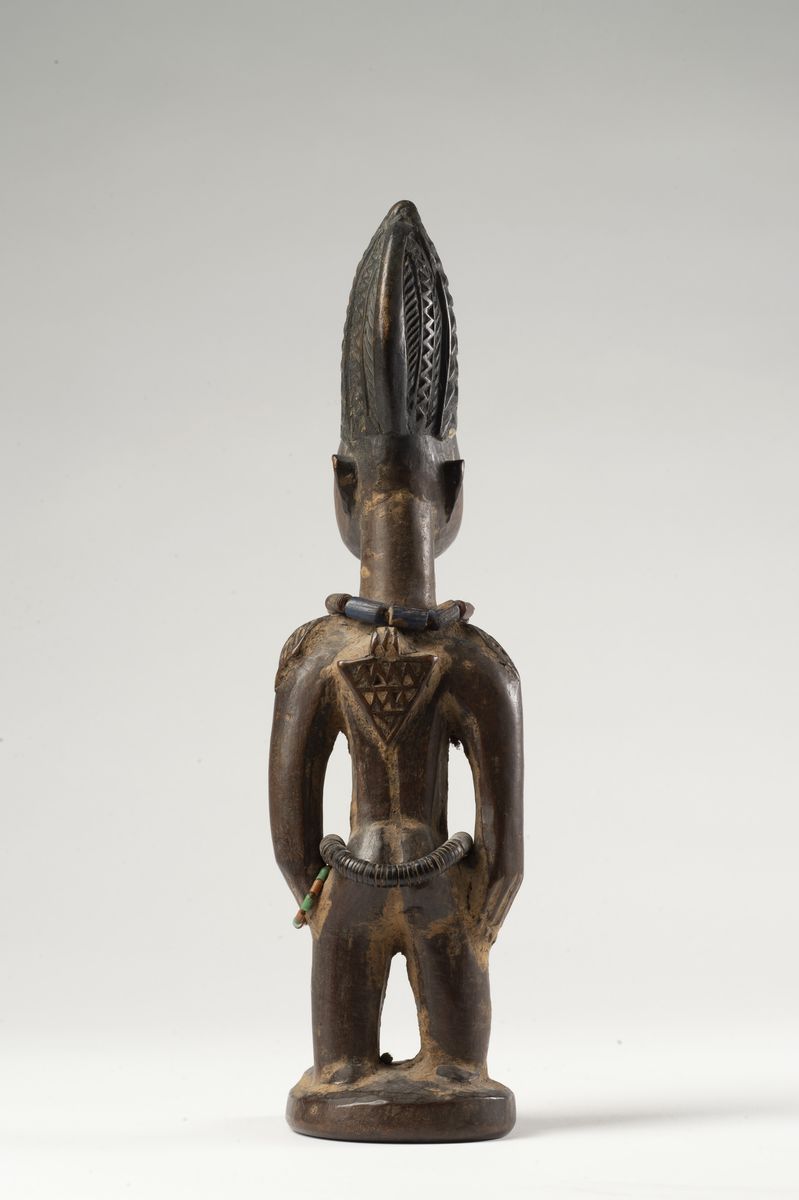 Figura femminile del culto dei gemelli “Ibeji”. Indossa collana e cintura di perline di vetro. Tatuaggi sul corpo.Il legno è stato ricoperto con un impasto di terra beige.