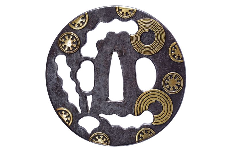 In ferro, maru-gata, ko-sukashi, taka-zogan in ottone a ruote e spirali; kaku-mimi-koniku, kozuka e kogai histu-ana. Periodo Edo, fine del XVII secolo.