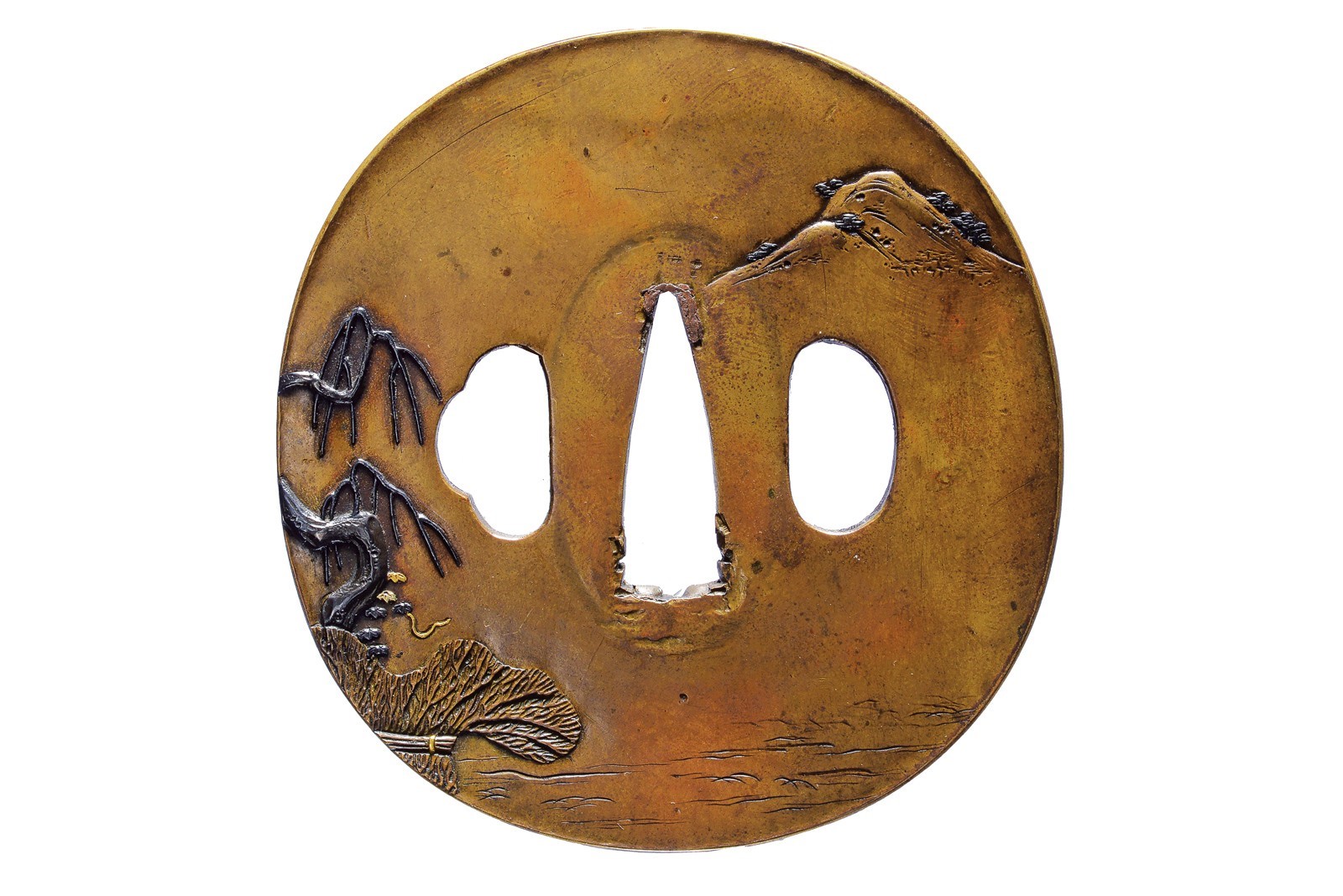 In ottone, tate-maru-gata; taka bori, decori in shakudo, oro, argento e rame, effigi di paesaggi su entrambe le facce; il lato omote recante anche un Torii accanto ad un albero e un contadino che porta fasci di legna. Kozuka e kogai hitsu-ana, mei, taka-m