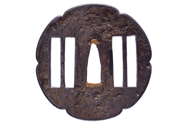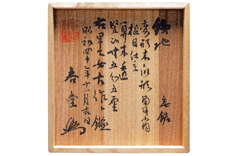In ferro, rokkaku-gata; ko-sukashi raffigurante rotoli, la superficie in tsuchime, sul lato sinistro ategane, sekigane in rame, taka-mimi. In kiri box. (Mimi 0.5 cm.)