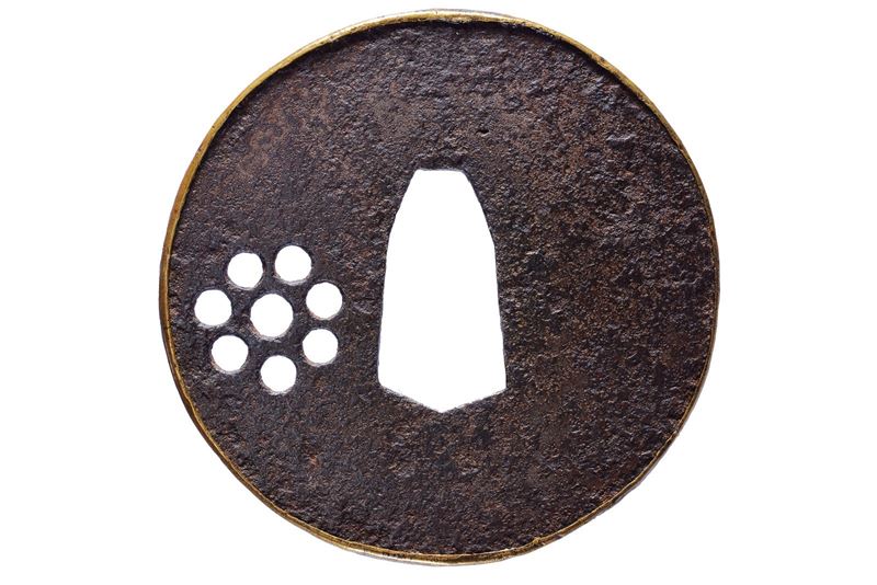 In ferro, maru-gata; la superficie liscia, con kamon realizzato in sukashi; grande nakago-ana per montare la guardia su un bokutō, mimi con fukurin in ottone. Molto rara. 1500 circa. In kiri-box.