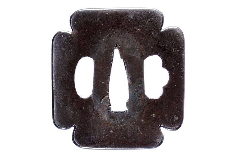 In shakudo, kirikomi-mokko-gata; migaki-ji, kozuka e kogai hitsu-ana, resti di sekigane in rame, kaku-mimi-kuniku.