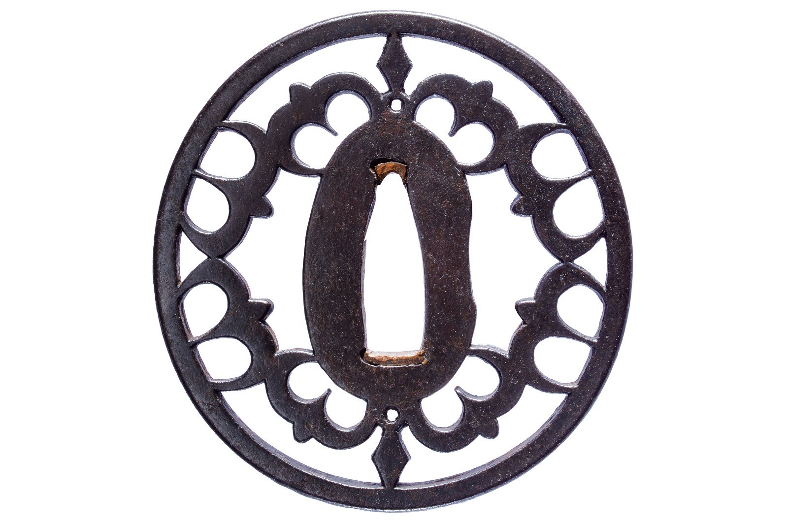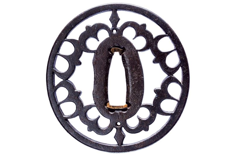 In ferro, tate-manu-gata; ko-sukashi con otto rondini in volo e con due profili a diamante (losanga), uno in alto, uno in basso; sekigane in rame. 1650-1700 circa.