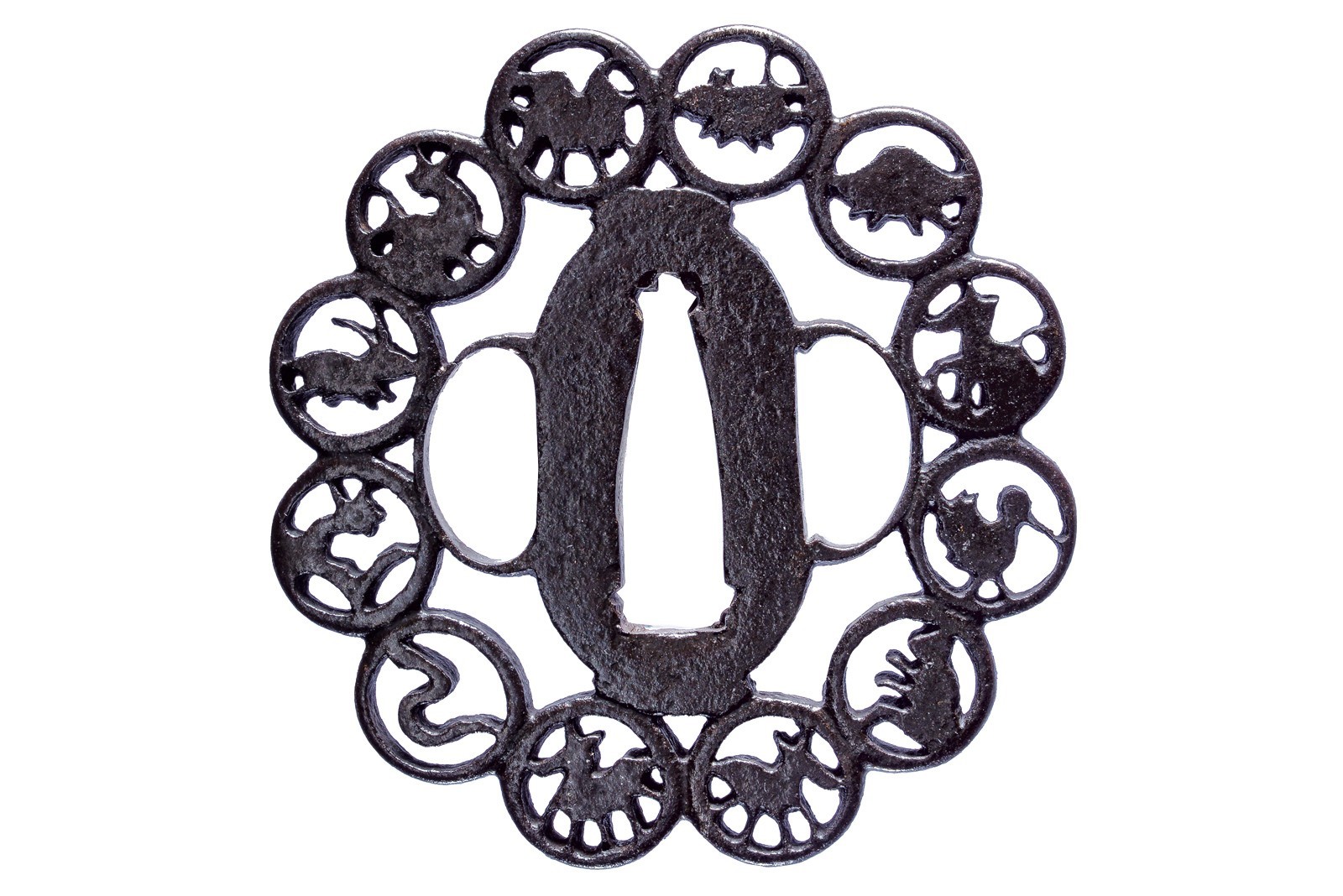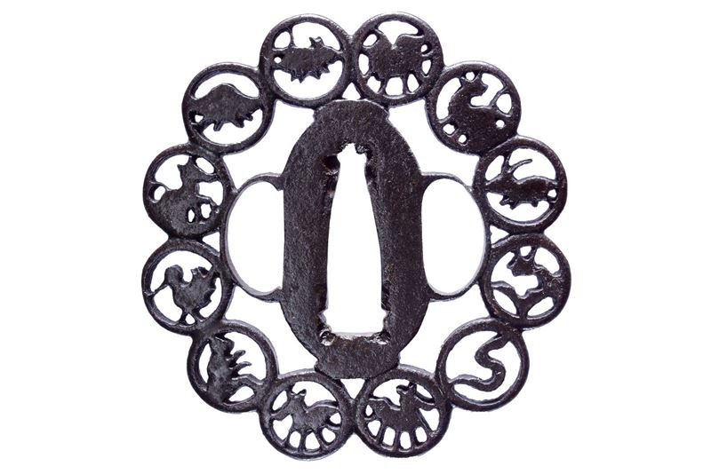In ferro, tate-maru-gata; ko-sukashi con effige dei dodici animali dello zodiaco giapponese, ognuno entro un cerchio; kozuka e kogai hitsu-ana. Seconda metà del XVIII secolo.