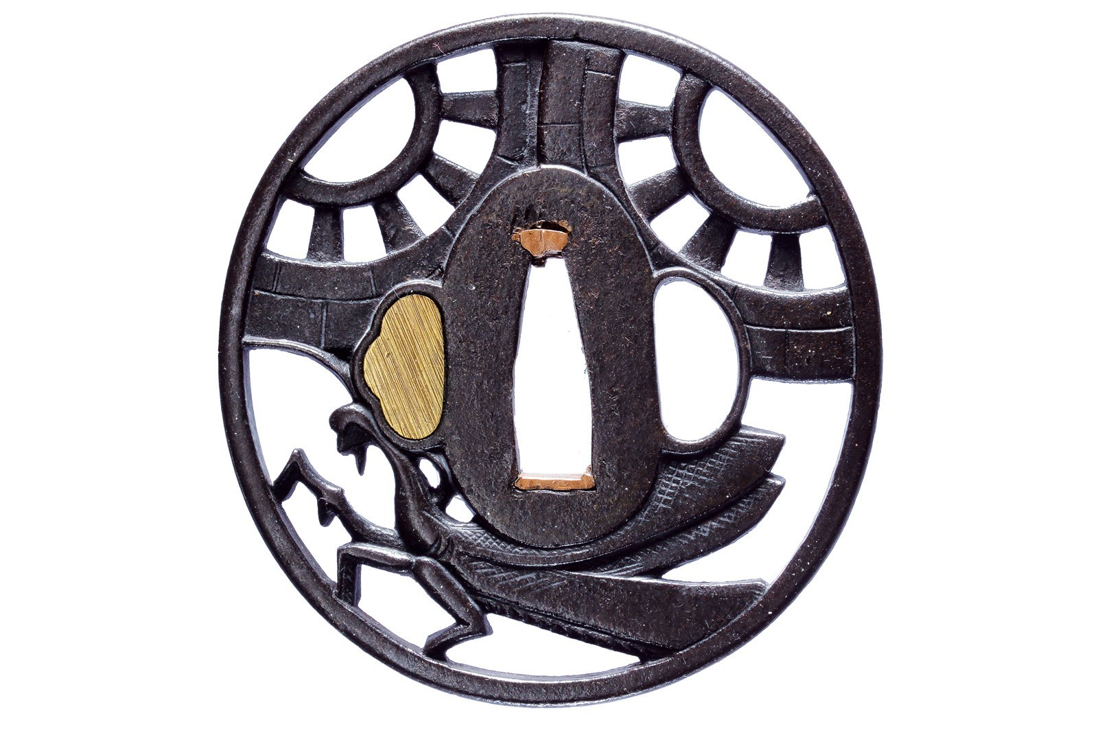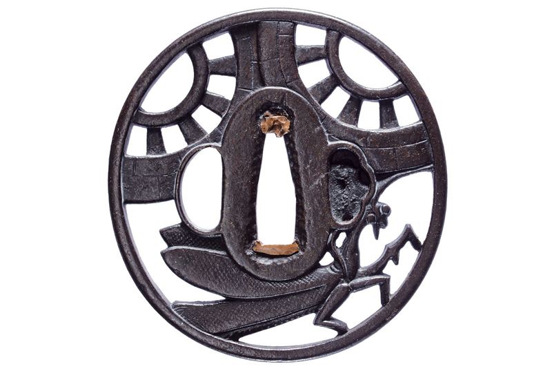 In ferro, tate-maru-gata; yo-sukashi con mantide e due ruote di carro; kozuka-hitsu-ana, kogai-hitsu-ana con ategane (incompleto sul lato posteriore), sekigane in rame, maru-mimi. 1750 circa.