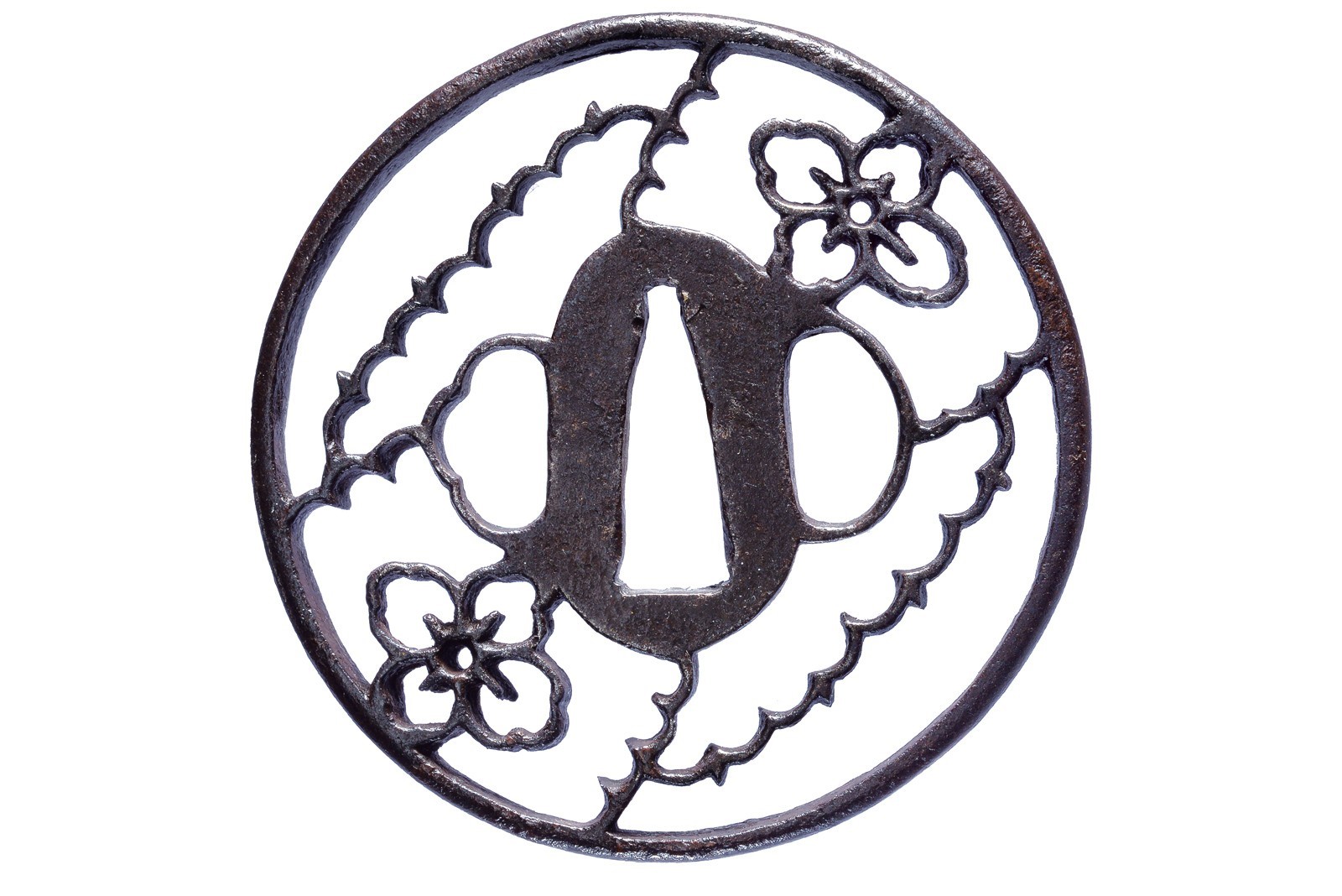 In ferro, maru-gata; sukashi con karabana-mon e file di oche in volo, kaku-mimi-koniku. 1700 circa.