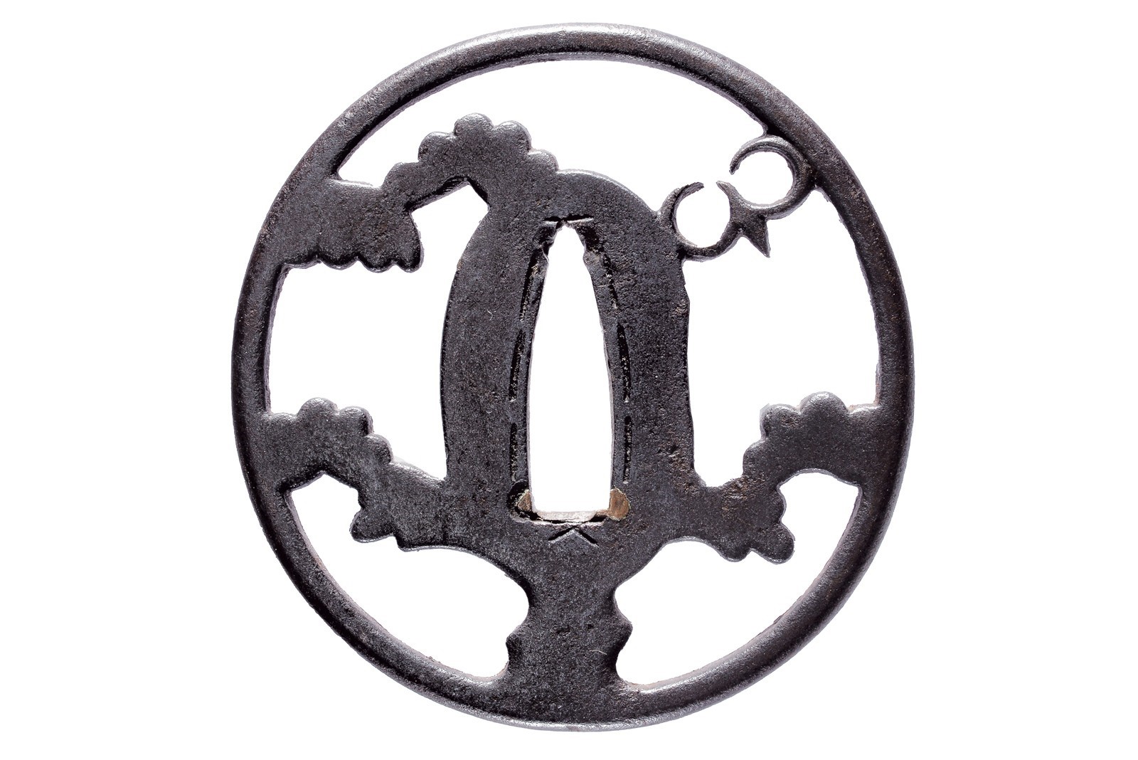 In ferro, tate-maru-gata; ko-sukashi con un uccello in volo sopra rami di pino stilizzati; resti di sekigane in rame, kaku-mimi-koniku. 1700 circa. In kiri-box.