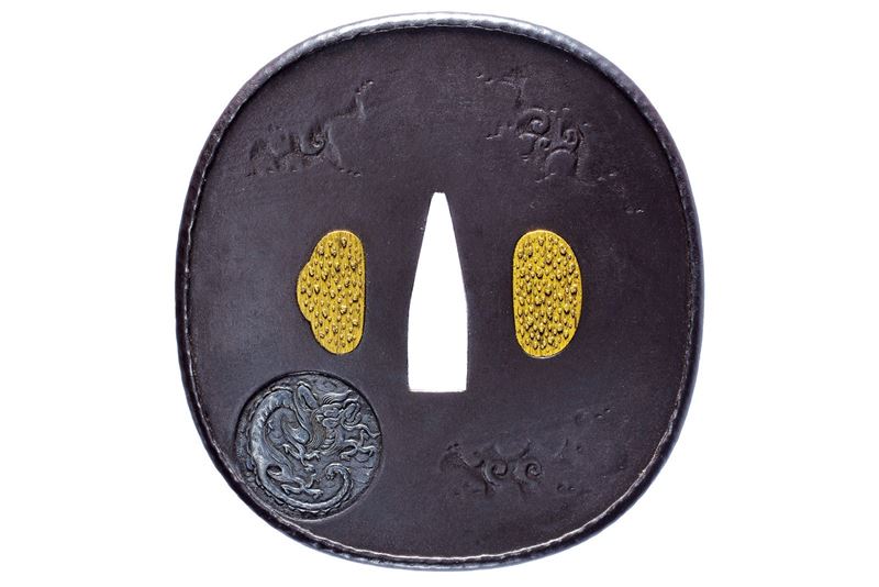 In ferro, tate-maru-gata; hira-zogan in argento, kogai e kozuka hitsu-ana riempiti in oro nekogaki, i medaglioni in shishiai-bori rimesso in argento, recanti effigi dell'uccello Hoo, un drago e un Shishi fra nuvole. Uchi-gaeshi-mimi. Seconda metà del XVII