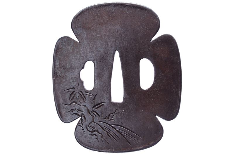 In ferro, mokko-gata; kata-kiri-bori, ten-zogan in oro; al recto: uccello poggiato su un ramo e intento a guardare una melagrana; al verso: erba. Uchi-gaeshi-mimi. Prima metà del XIX secolo. (Mimi 0.4 cm)