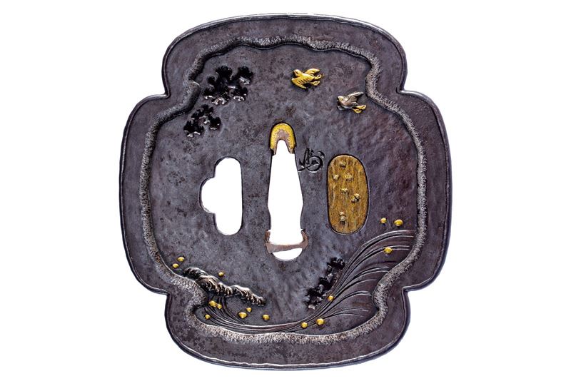 In ferro, mokko-gata; sukidashi-bori, taka-zogan in oro, argento e shakudo, ten-zogan in oro; al verso: àncora, conchiglie e uccelli davanti alla luna; al recto: uccelli e onde. Sekigane in rame con nunome-zogan in oro, kozuka-hitsu-ana con ategane in oro