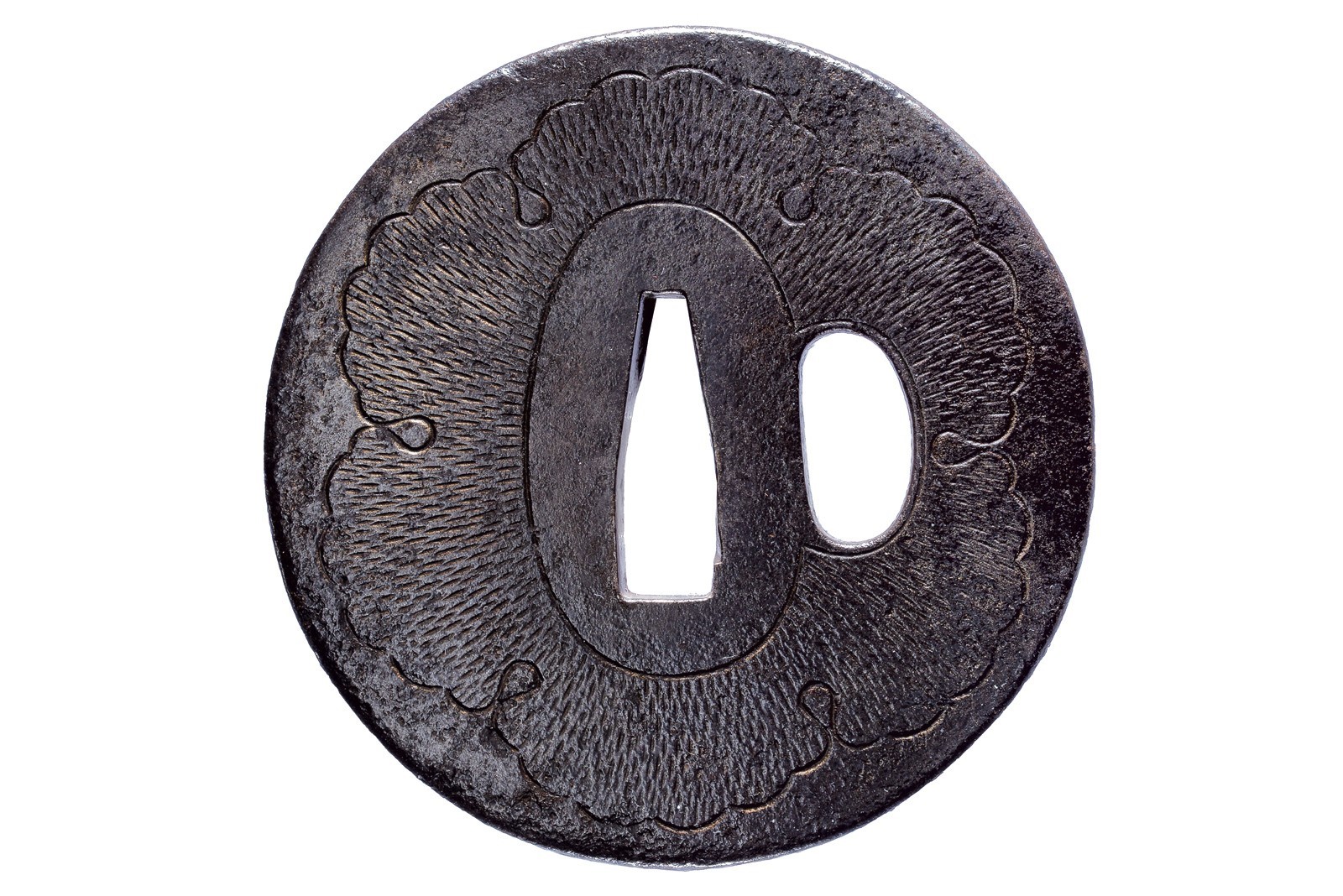 In ferro, maru-gata; ke-bori raffigurante un fiore a sei petali su entrambi i lati in stile Amida; mei, kozuka hitsu-ana, maru-mimi. 1600-1650 circa.