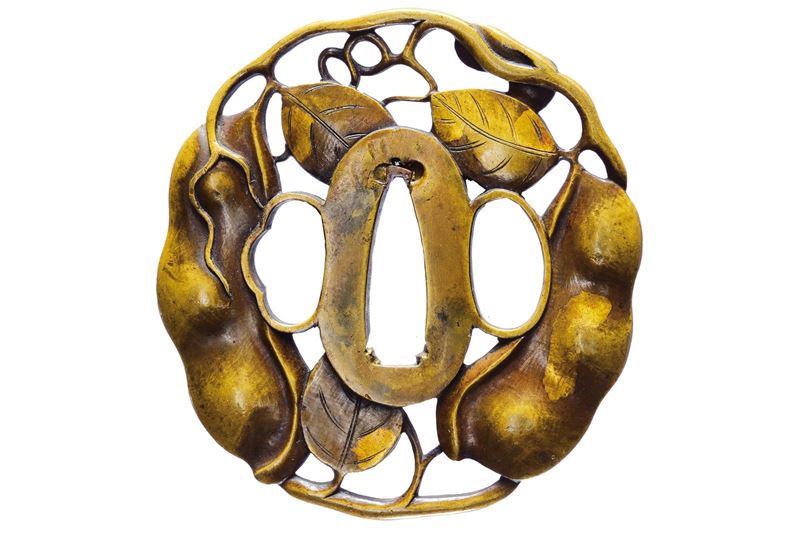 In ottone, di forma irregolare; yo-sukashi, maru-bori, effige di due baccelli di fagiolo parzialmente con nunome-zogan in oro; kozuka e kogai histu-ana, mei. 1675–1700 circa.