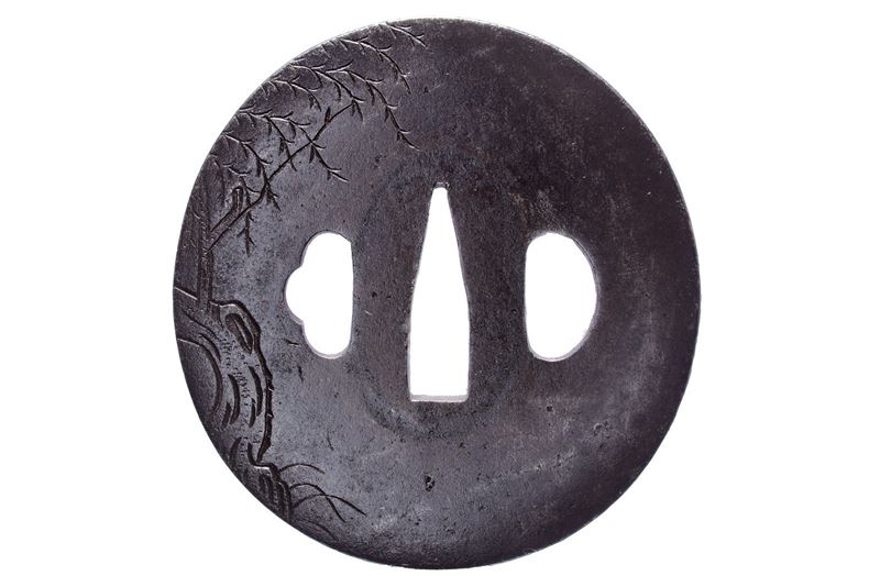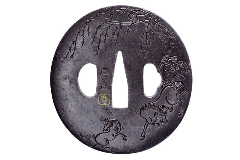 In ferro, tate-maru-gata; katakiri-bori; decoro con cavalli sotto a rami spioventi (al recto) e con un albero (al verso); kaku-mimi-koniku. Seconda metà del XVIII secolo. (Mimi 0.35 cm)