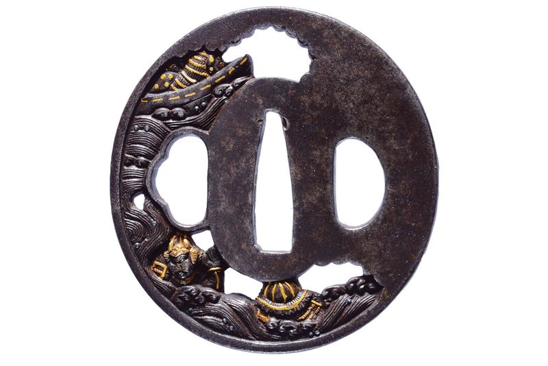 Tsuba in ferro, tate-maru-gata; sukashi con niku-bori in shakudo, oro ed argento; raffigurazione con scena di samurai ingaggiati in una battaglia navale; kozuka e kogai hitsu-ana, mei, kaku-mimi-koniku. 1850 circa.