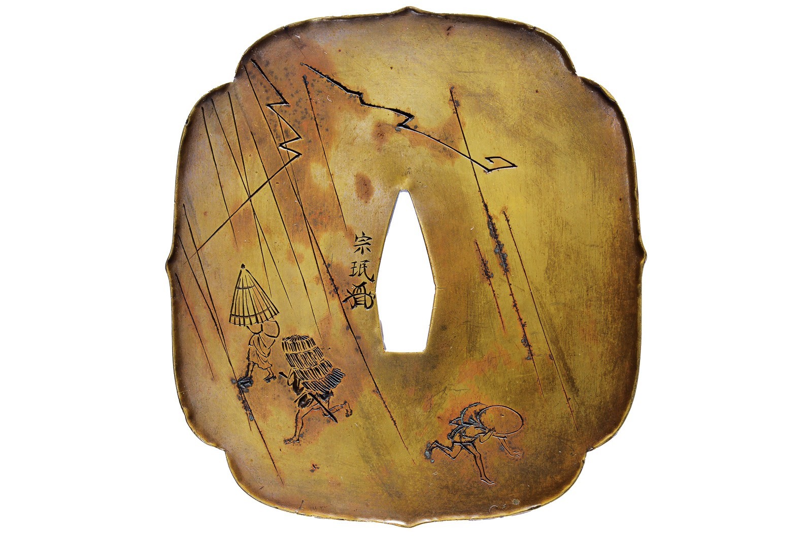 In ottone, mokko-gata; katakiri-bori con bella raffigurazione del dio del tuono Raiden tra tamburi, fulmini e nuvole, gli occhi e denti in ten-zogan in oro, sul lato ura tre viandanti che si proteggono dal temporale e fuggono da fulmini; mei, taka-mimi. U
