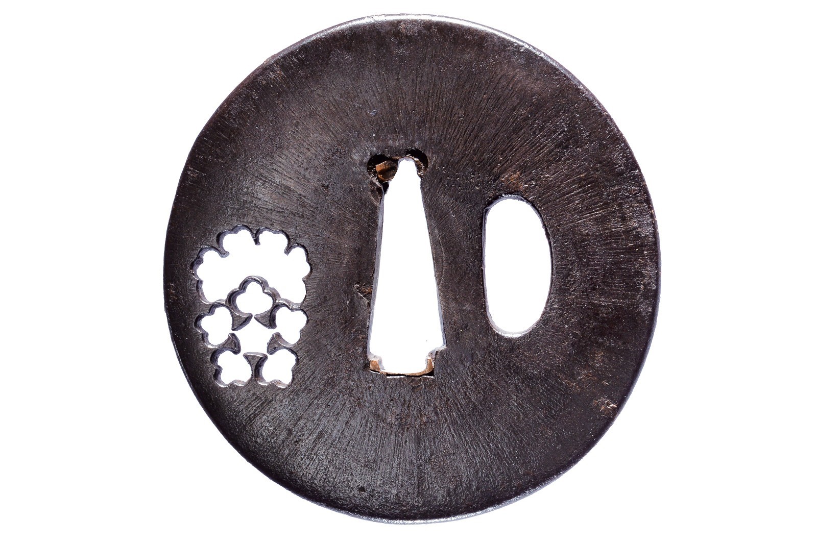 In ferro, maru-gata; la superficie liscia, con Amida-yasuri ancora ben visibile, fine sukashi floreale; kozuka hitsu-ana, sekigane in rame, ko-maru-mimi. 1700 circa.