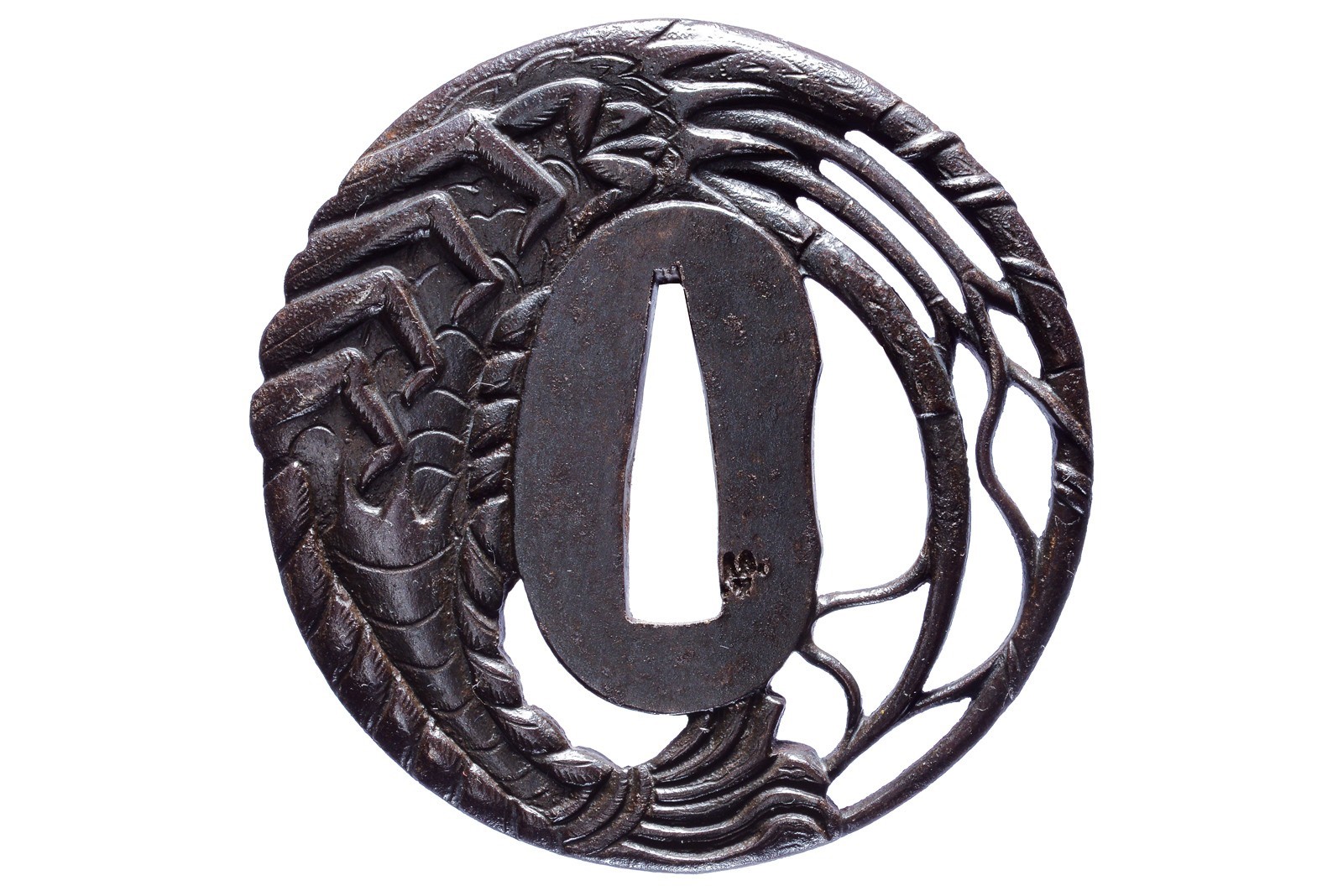 In ferro, sukashi, maru-bori, finissima raffigurazione di un ebi (gambero), mei. 1600 circa.