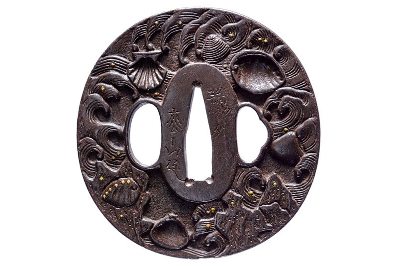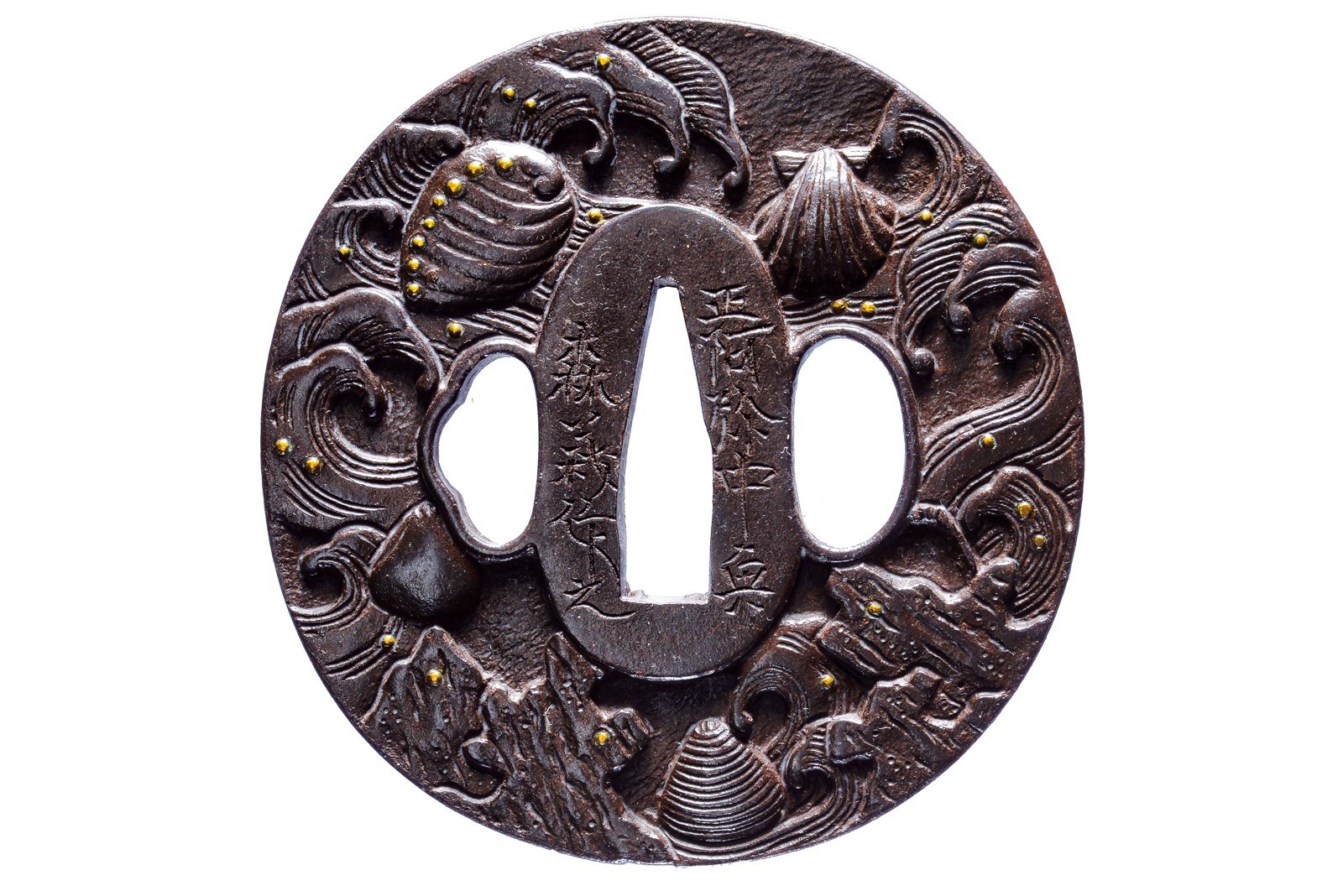 In ferro, tate-maru-gta; taka-bori con onde, scogli e numerose conchiglie marine, con piccoli punti d’oro in nunome (kin nunome) a simulare gli spruzzi; mei, kozuka e kogai hitsu-ana, kaku-mimi. 1800 circa. Rara e di buona qualità.