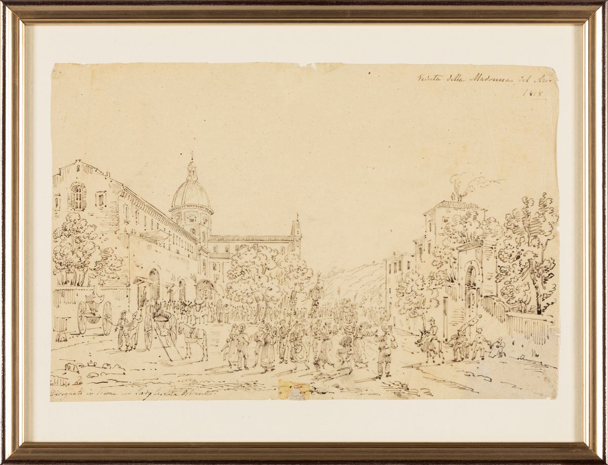 intitolato e datato in alto a destra: Veduta della Madonna del Arco / 1818 e inscritto in basso a sinistra: Disegnato in sieme con Lady Charlotte Osborne
