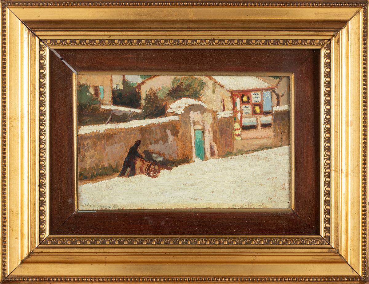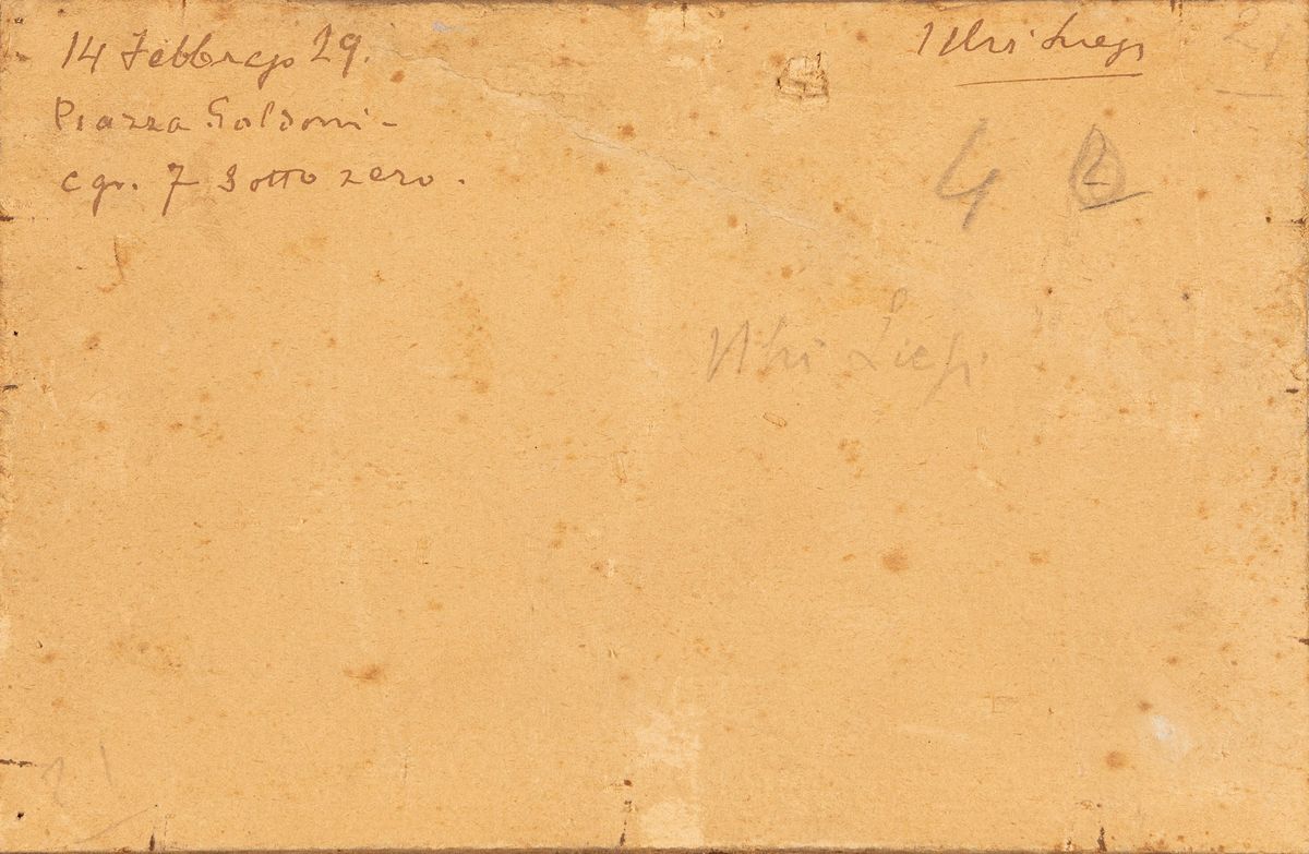 Sul retro, firma, data e titolo di mano dell'artista (14 febbraio 29. / Piazza Goldoni. / c gr. 7 sotto zero.)