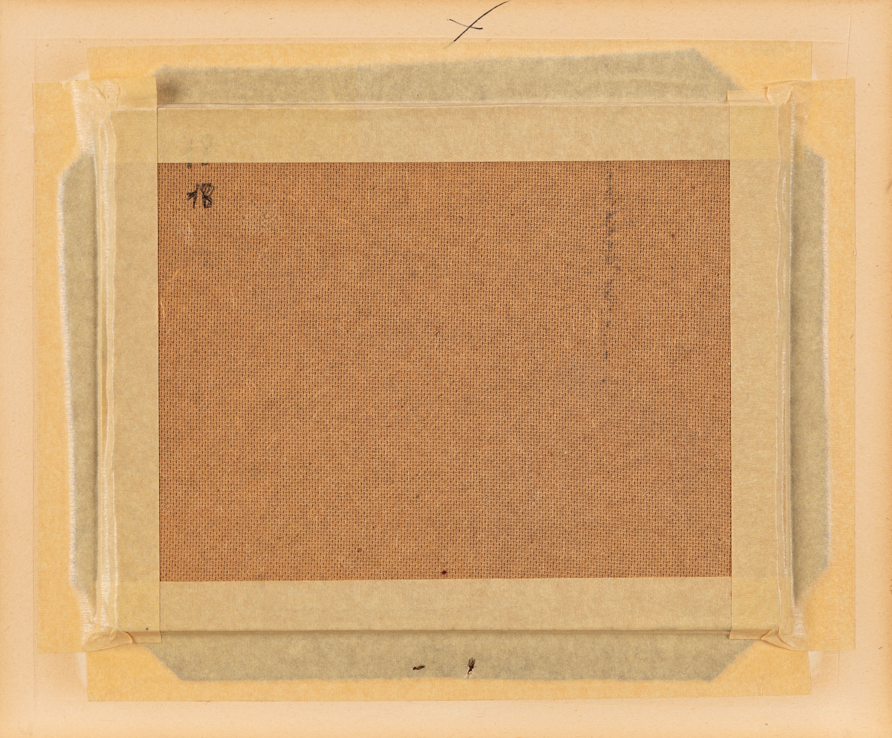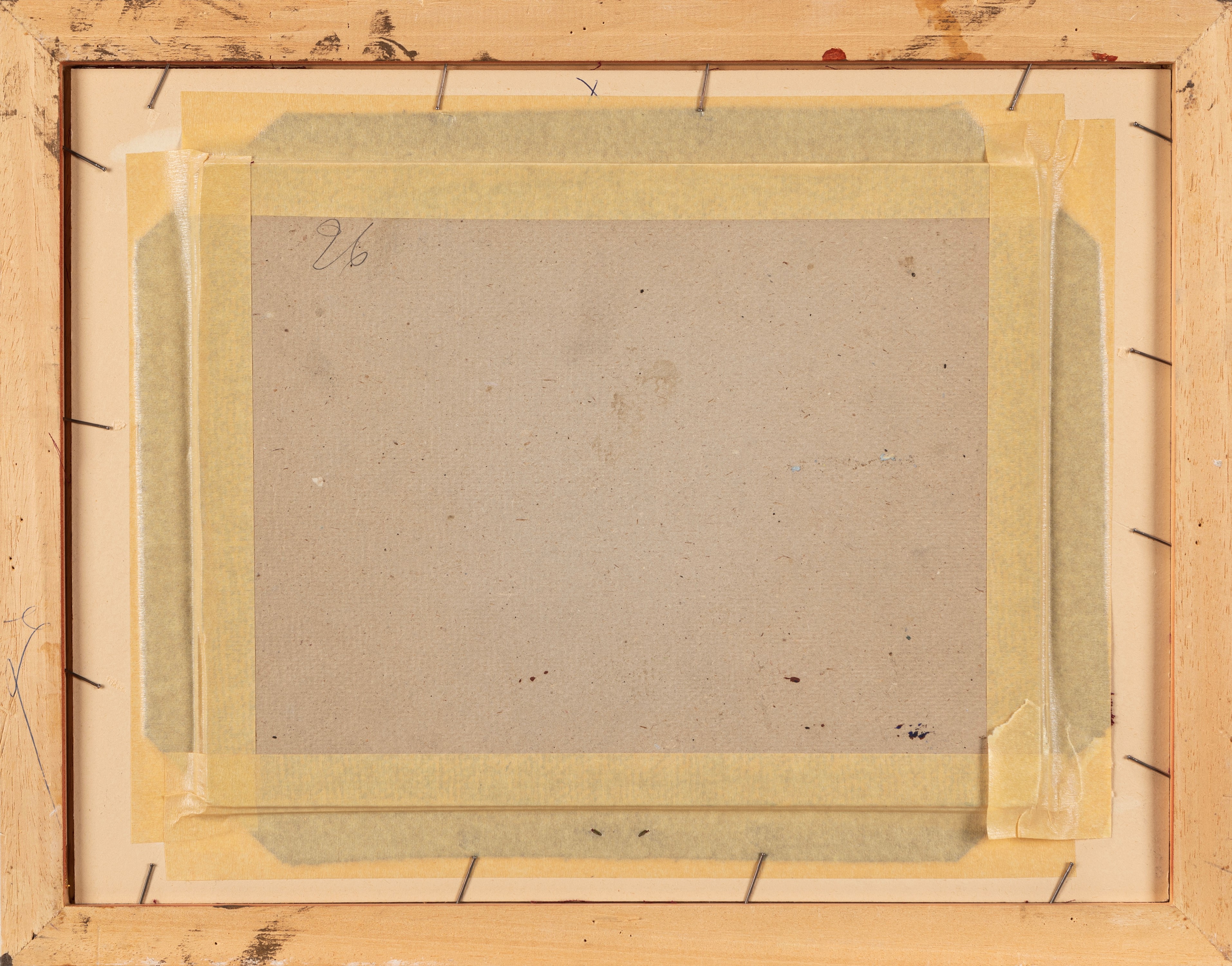 Sul retro, sul cartoncino di chiusura, etichette relative alla provenienza (Collezione Meregalli) con numeri 45 e 50.