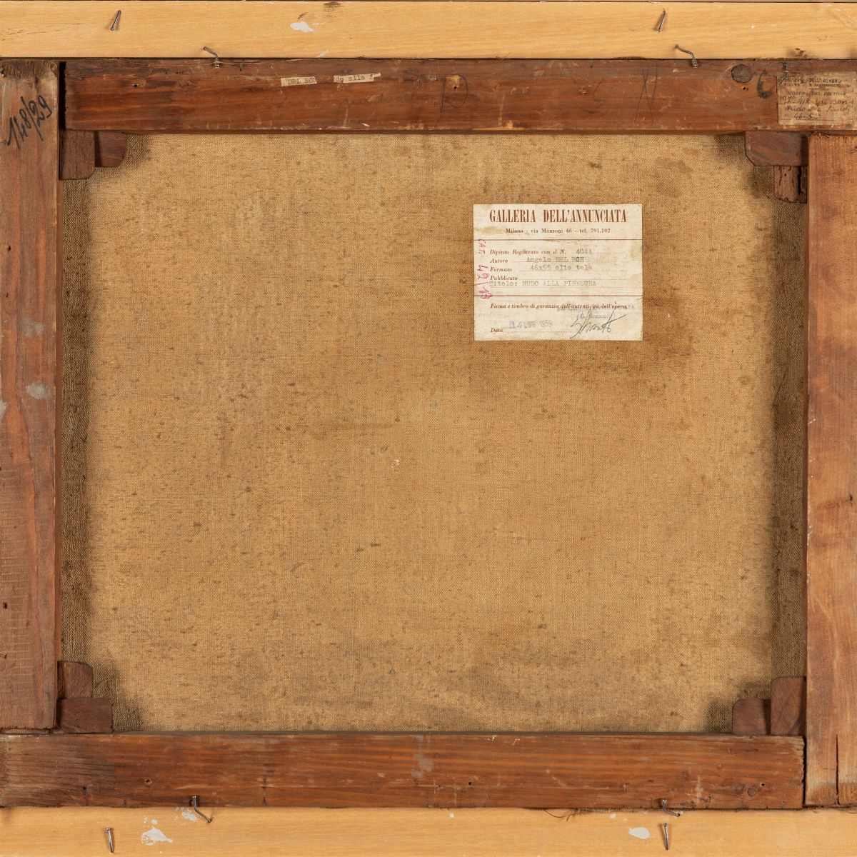 al retro, sul supporto e sul telaio, due etichette della Galleria dell'Annunciata, Milano, con titolo; e timbro della stessa