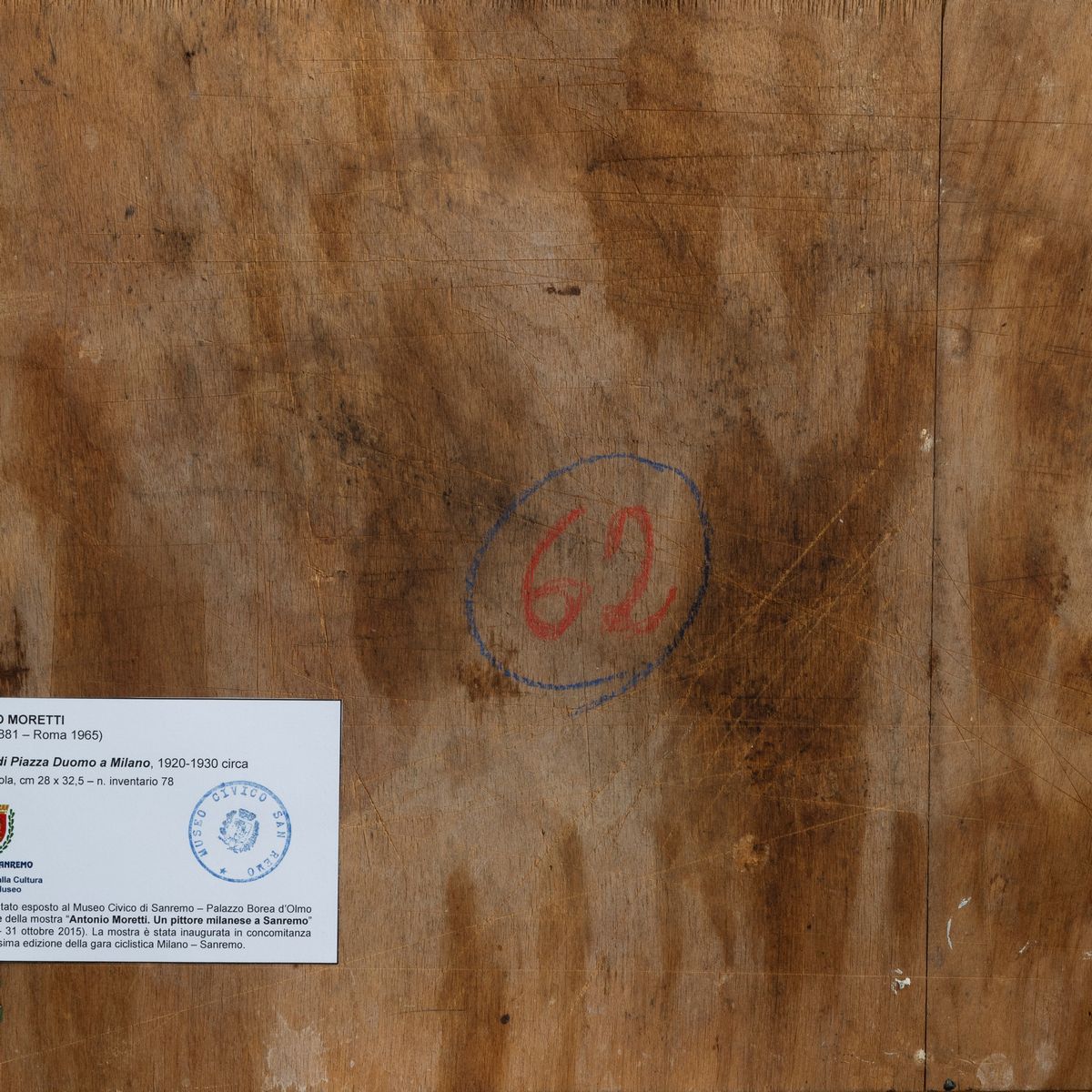 al retro, numero di riferimento (62) e cartellino a stampa con riferimenti all'opera e timbro del Museo Civico di Sanremo in occasione della mostra Antonio Moretti. Un pittore milanese a Sanremo (21 marzo - 31 ottobre 2015)
