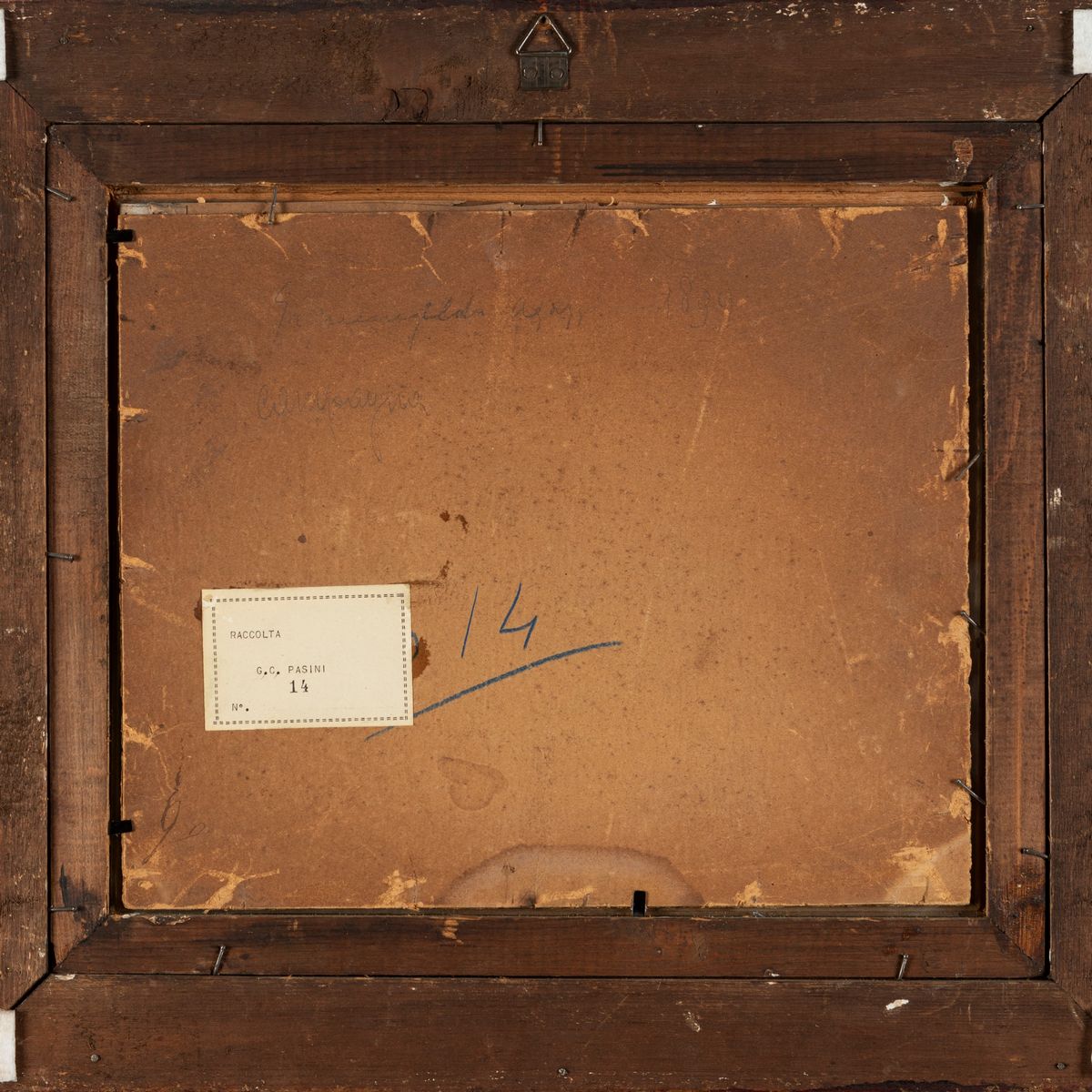 sempre al retro, sul cartoncino di chiusura, etichetta relativa alla provenienza: Raccolta G. C. Pasini