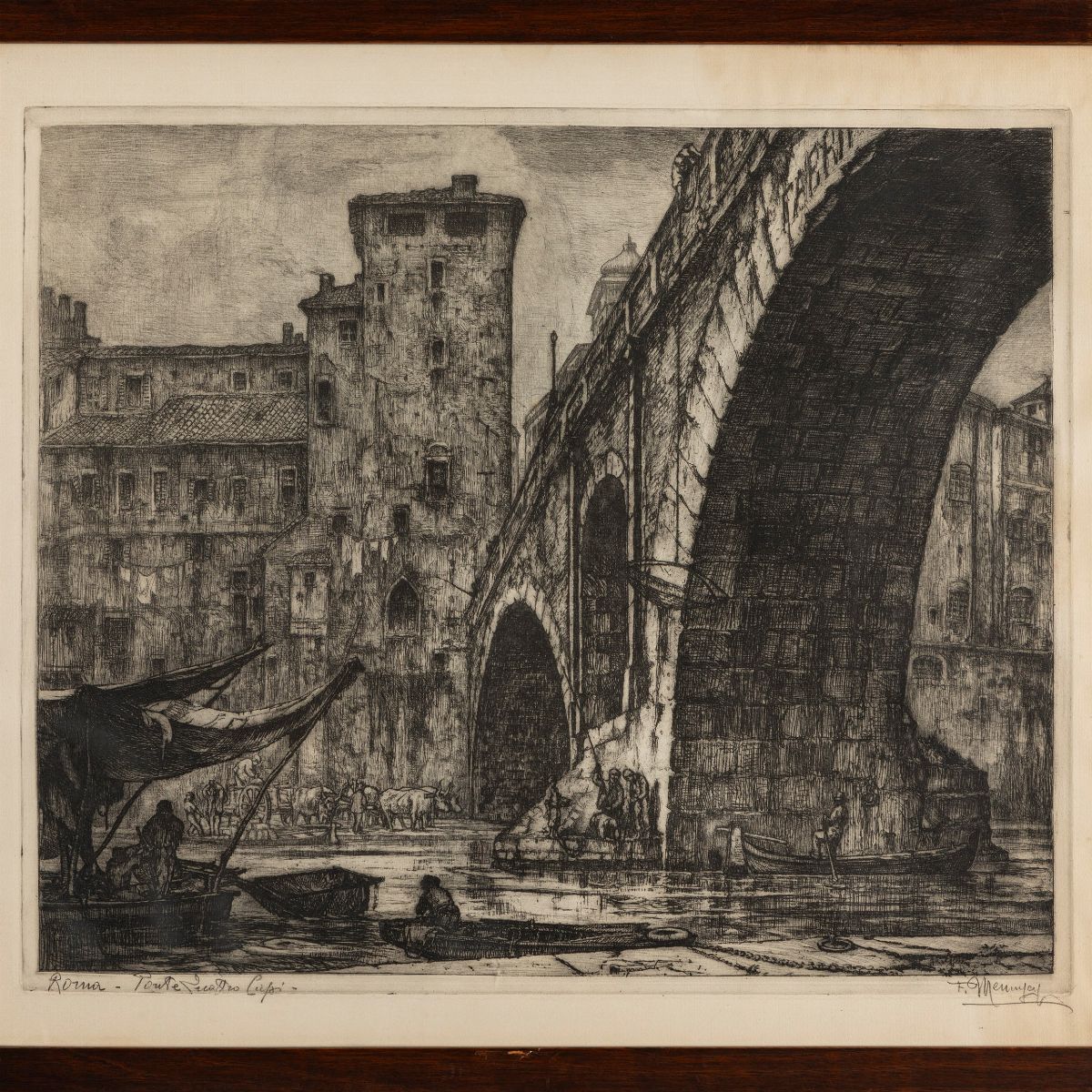 in basso, fuori dalla lastra, firmata a destra a matita: F. Mennyey; e titolata a sinistra: Roma-Ponte Quattro Capi