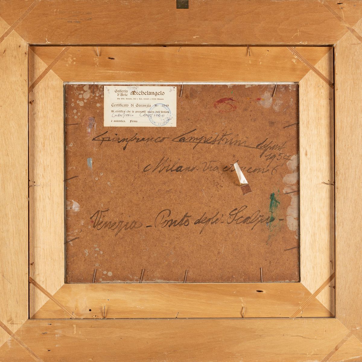 al retro, sul supporto, firmato e titolato; sempre al retro etichetta e timbro della Galleria d'Arte Michelangelo di Milano