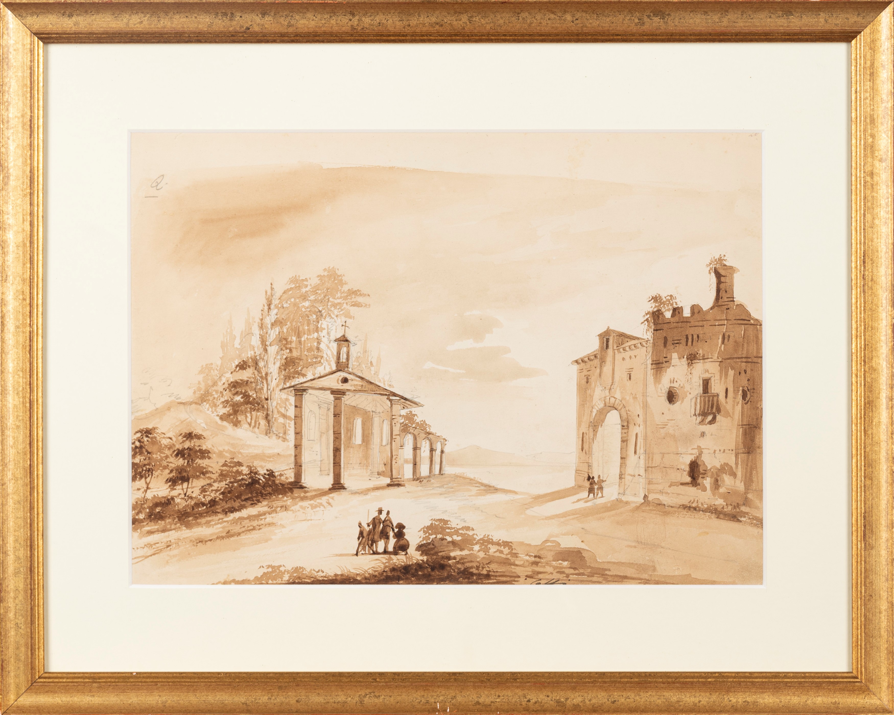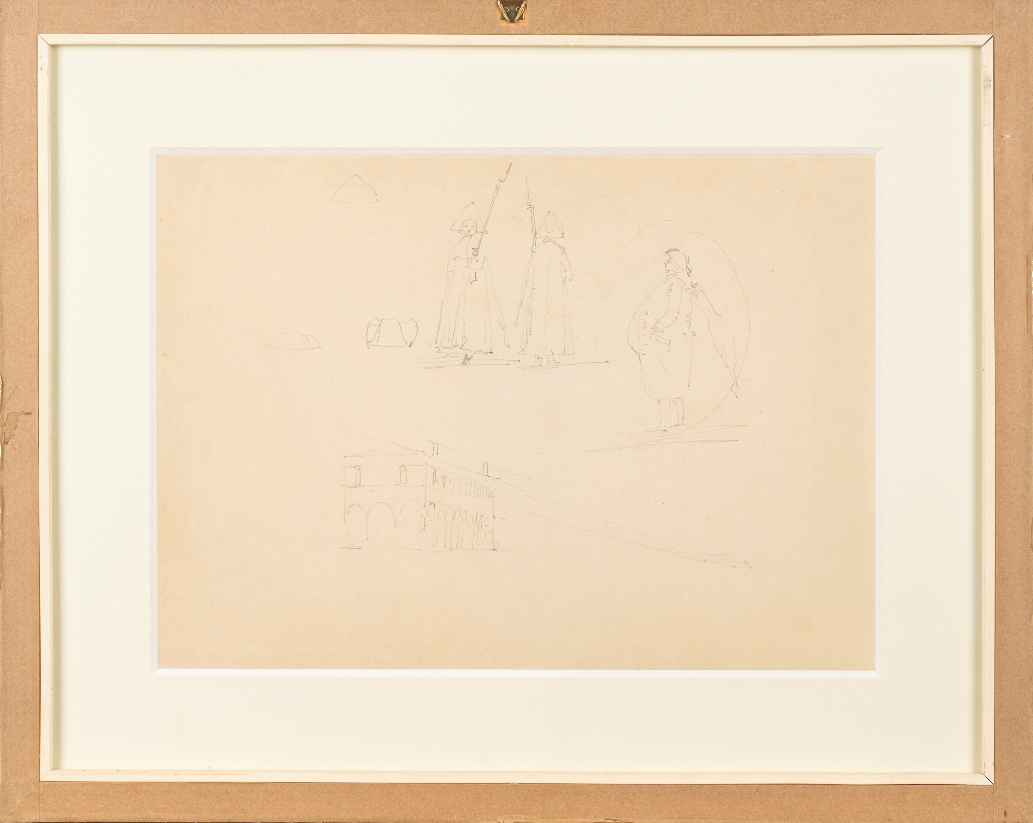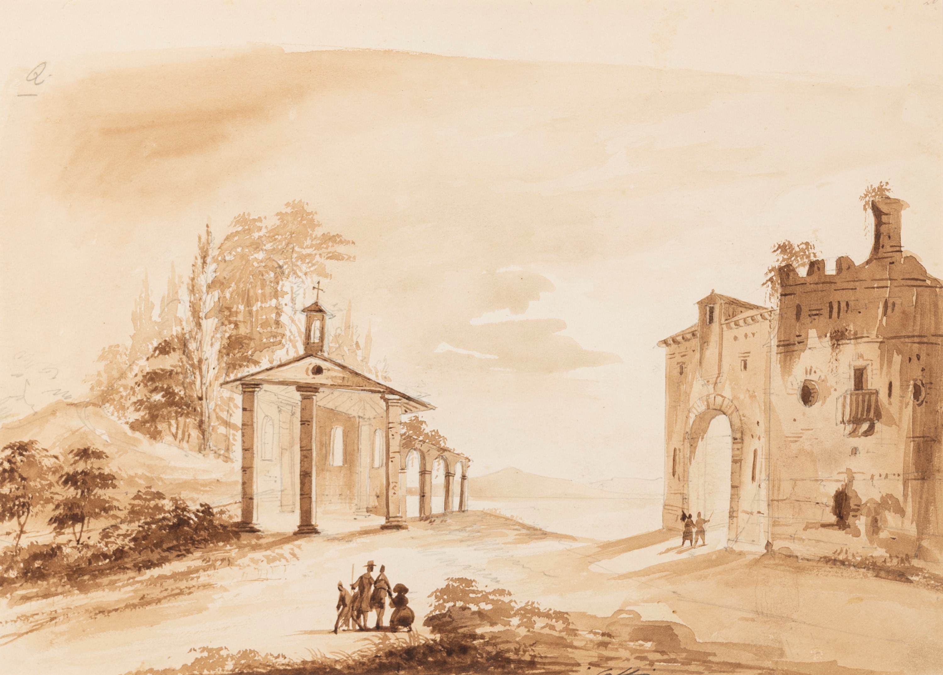 b) Rovine; sul retro, studi di figure a matita