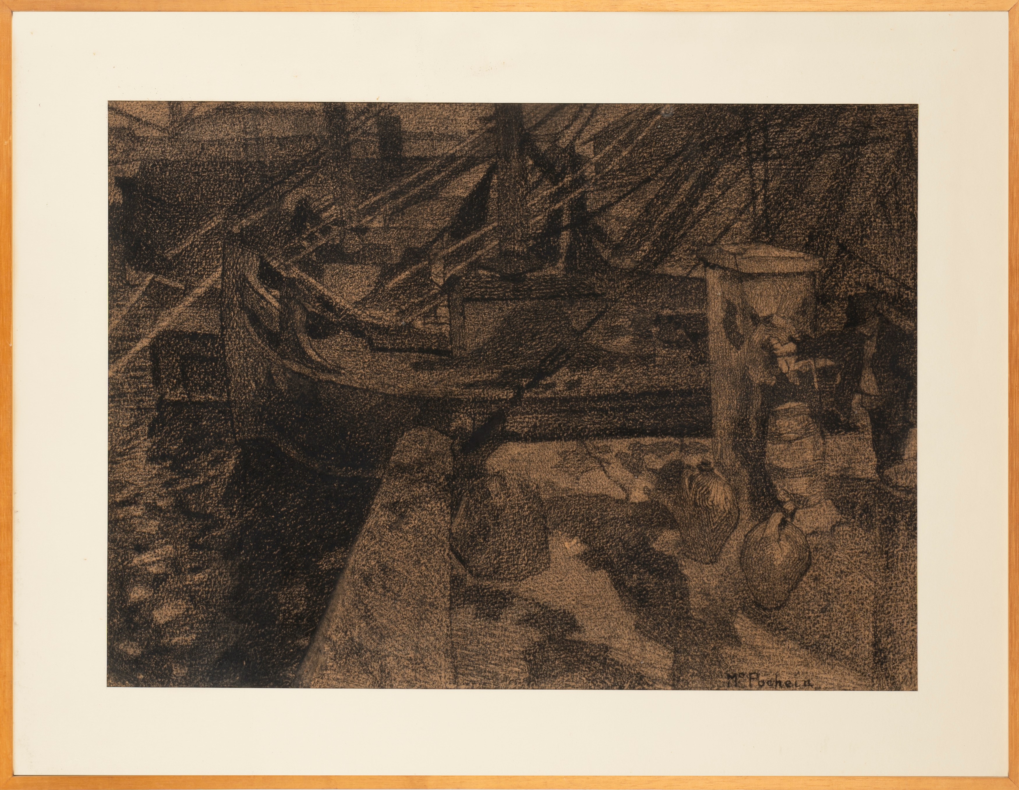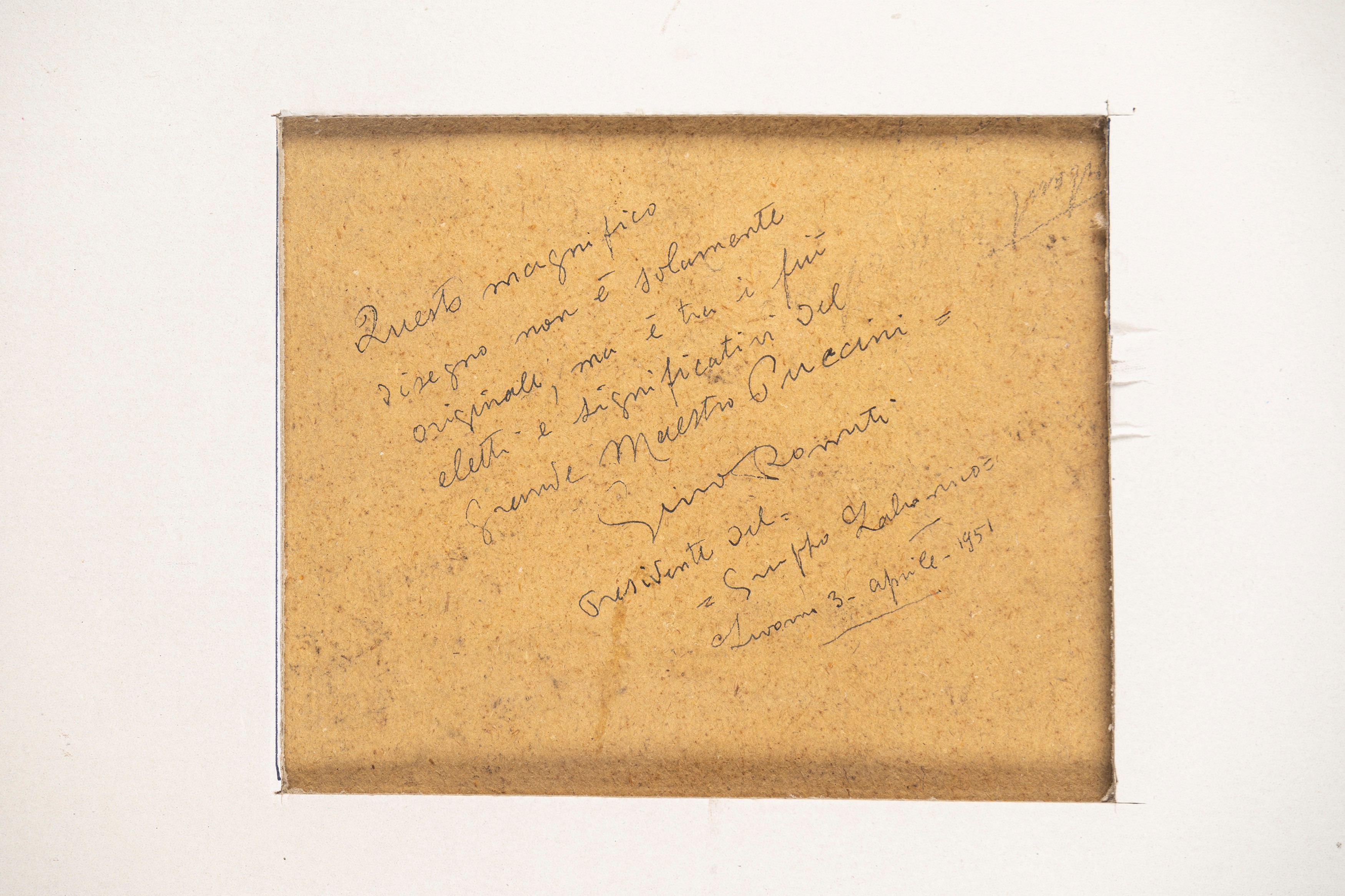 al retro, dichiarazione di autenticità manoscritta di Gino Romiti: Questo magnifico / disegno non è solamente / originale, ma è tra i più / eletti e significativi del / Grande Maestro Puccini. / Gino Romiti / Presidente del / -Gruppo Labronico - / Livorno 3. aprile. 1951