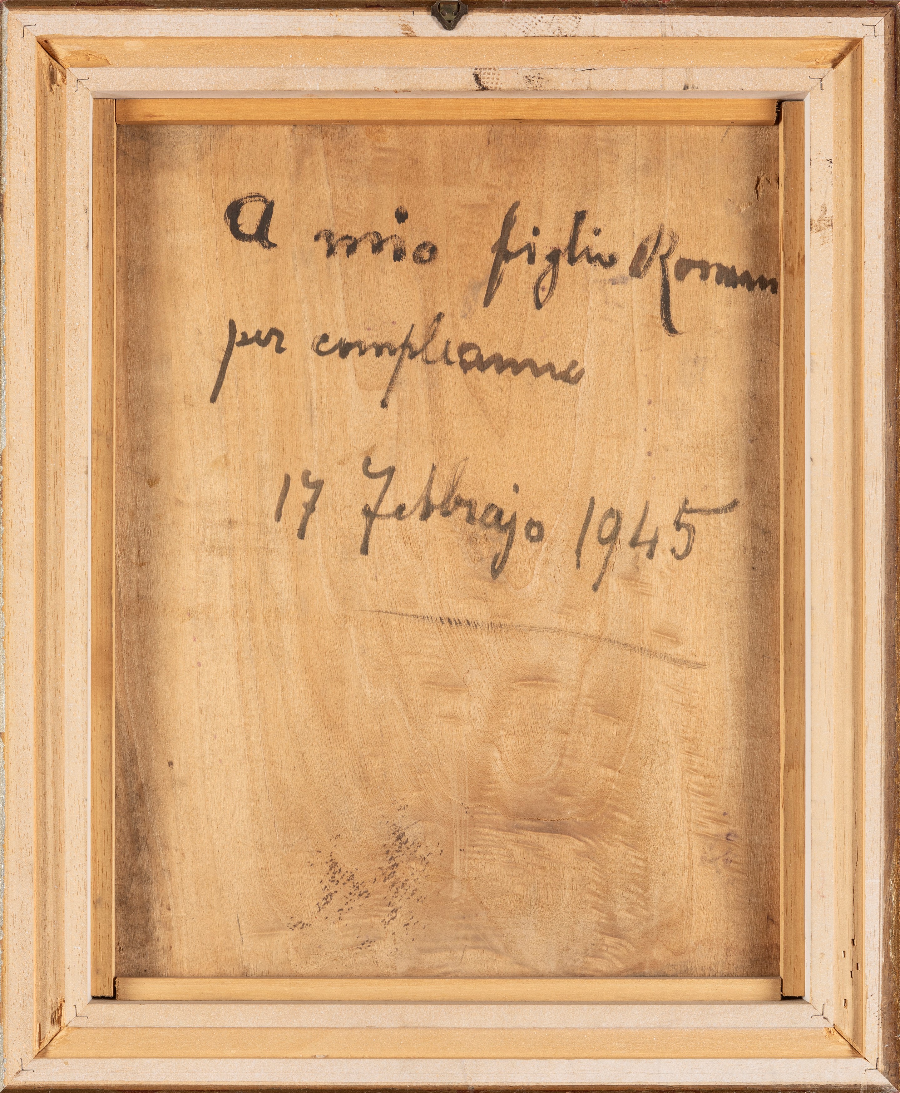 al retro, sulla tavola, dedica del pittore: a mio figlio Romano / per compleanno / 17 febbraio 1945